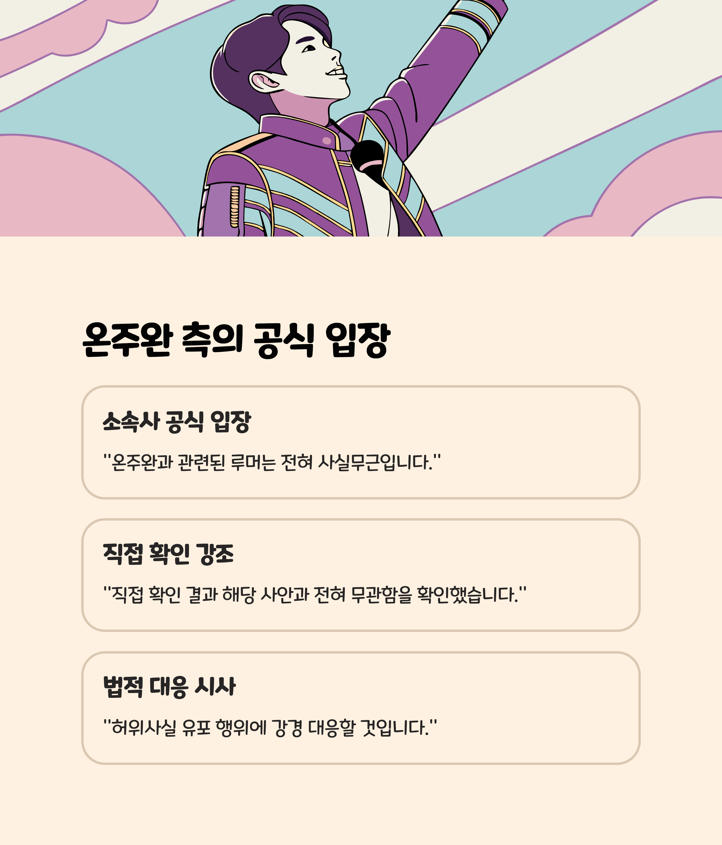 이장우는 SNS를 통해 자신이 해당 루머의 대상이 아니라고 직접 해명했고, 온주완 소속사도 “사실 무근”이라며 강경 대응을 시사했습니다. 두 배우 모두 명예를 지키기 위해 적극적으로 대응했으며, 허위 정보 유포에 강력 대응 의사를 밝혔습니다.
