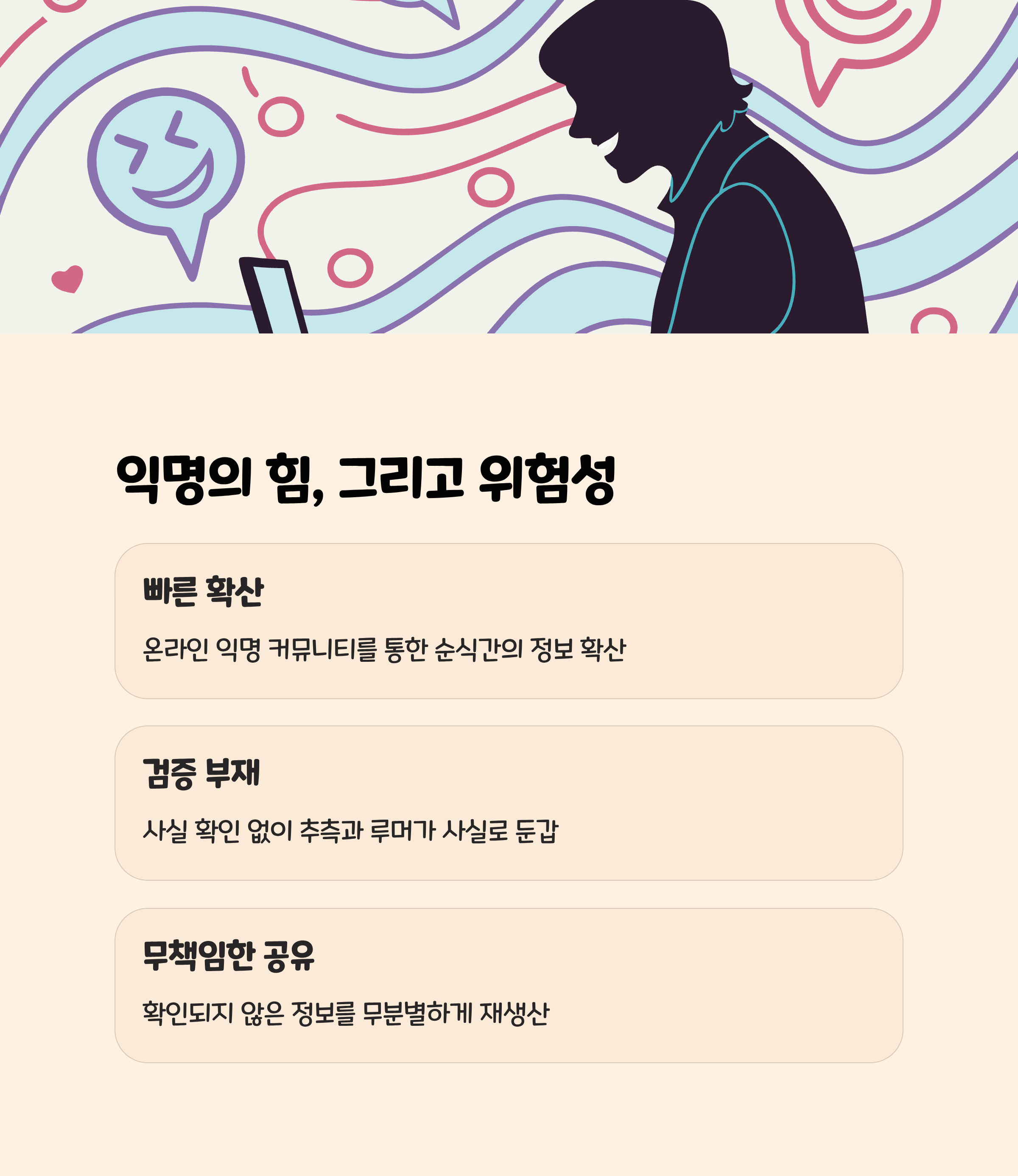 초성과 단서만으로 사람을 특정하는 것은 무고한 인물에게 사실과 전혀 다른 이미지가 붙을 수 있습니다. 이는 명예 훼손에 가까우며, 가짜 뉴스와 비슷한 파급력을 갖는 매우 위험한 행위입니다.