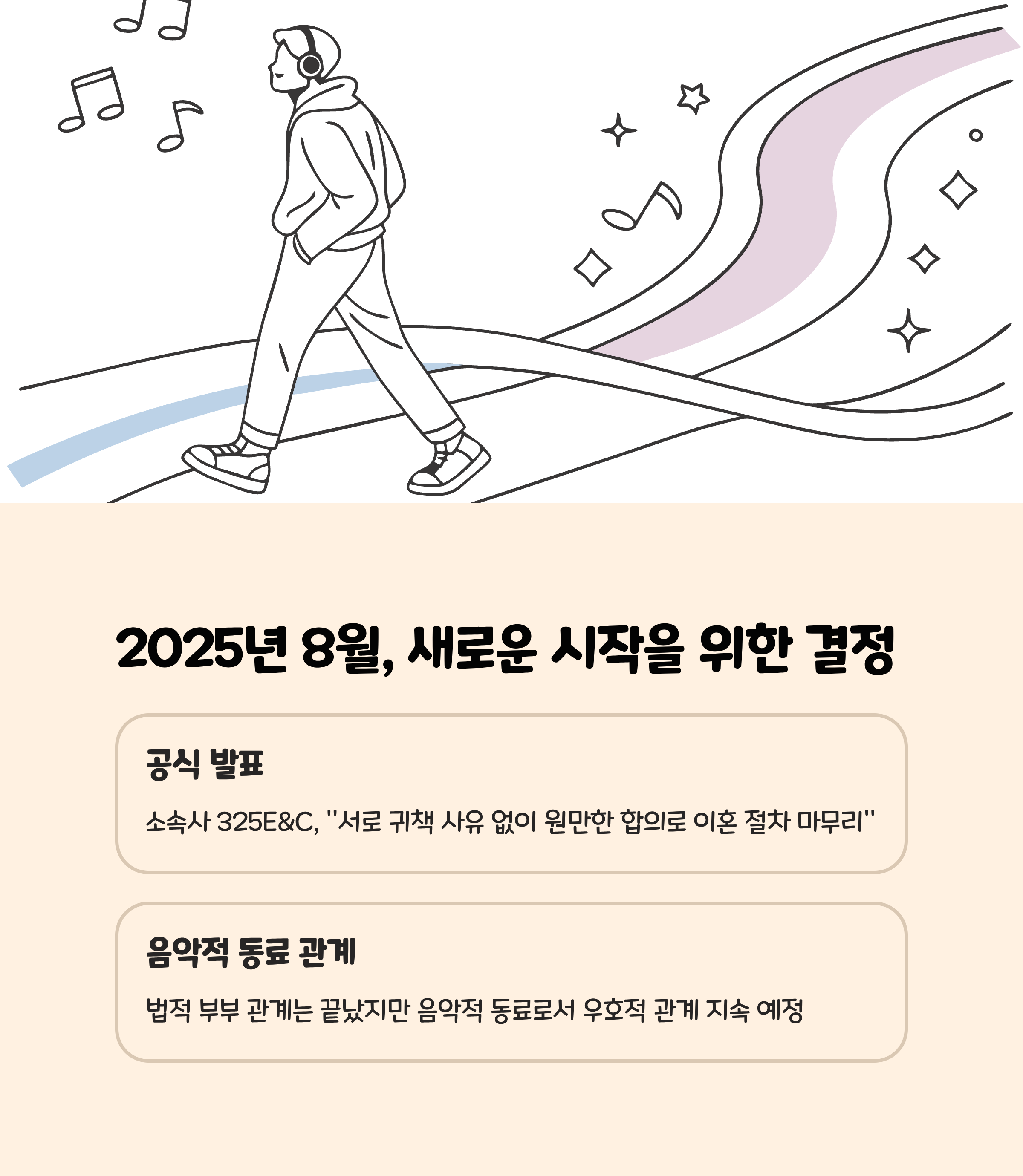 법적 부부 관계는 종료됐지만 음악적 동료로서 서로를 존중하고 응원하는 관계를 유지할 예정입니다. 같은 소속사에서 활동하며 각자의 음악 경력을 이어갑니다.