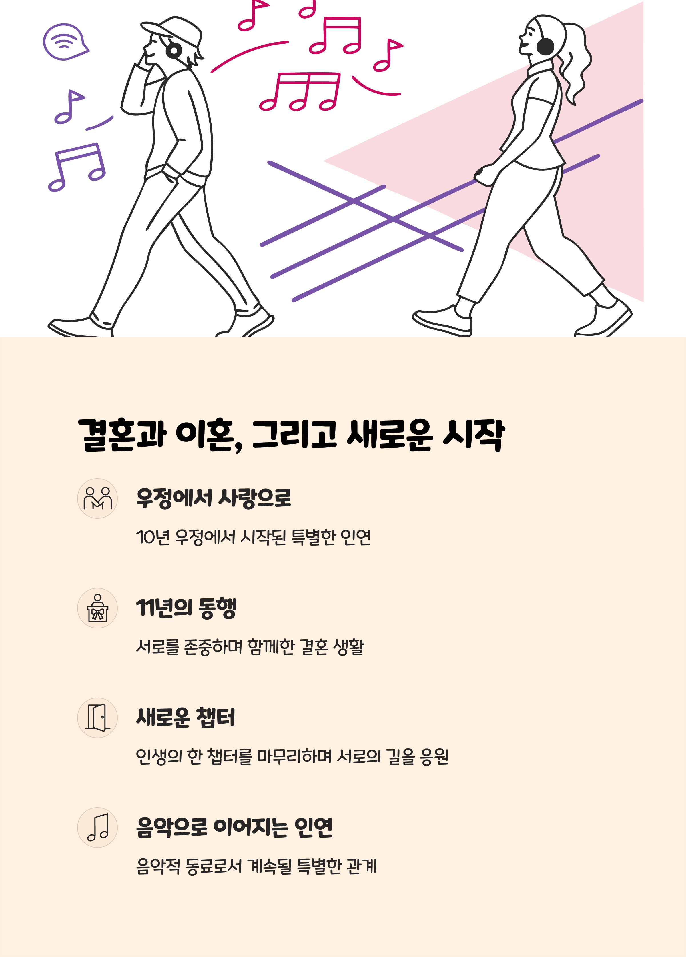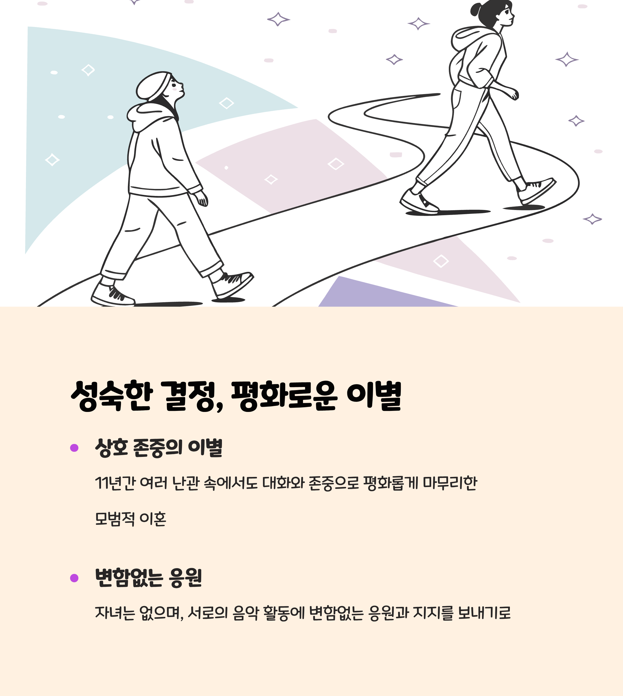11년간 이어진 결혼 생활 동안, 두 사람은 서로의 음악과 예술 활동을 깊이 이해하며 지지해왔습니다. 부부 관계가 법적으로 끝났지만, 서로를 존중하며 음악적 동료로서 관계를 꾸준히 유지할 것이라는 점이 특히 인상적입니다. 같은 소속사에서 활동하는 만큼 앞으로도 각자의 위치에서 응원할 모습을 기대할 수 있습니다.