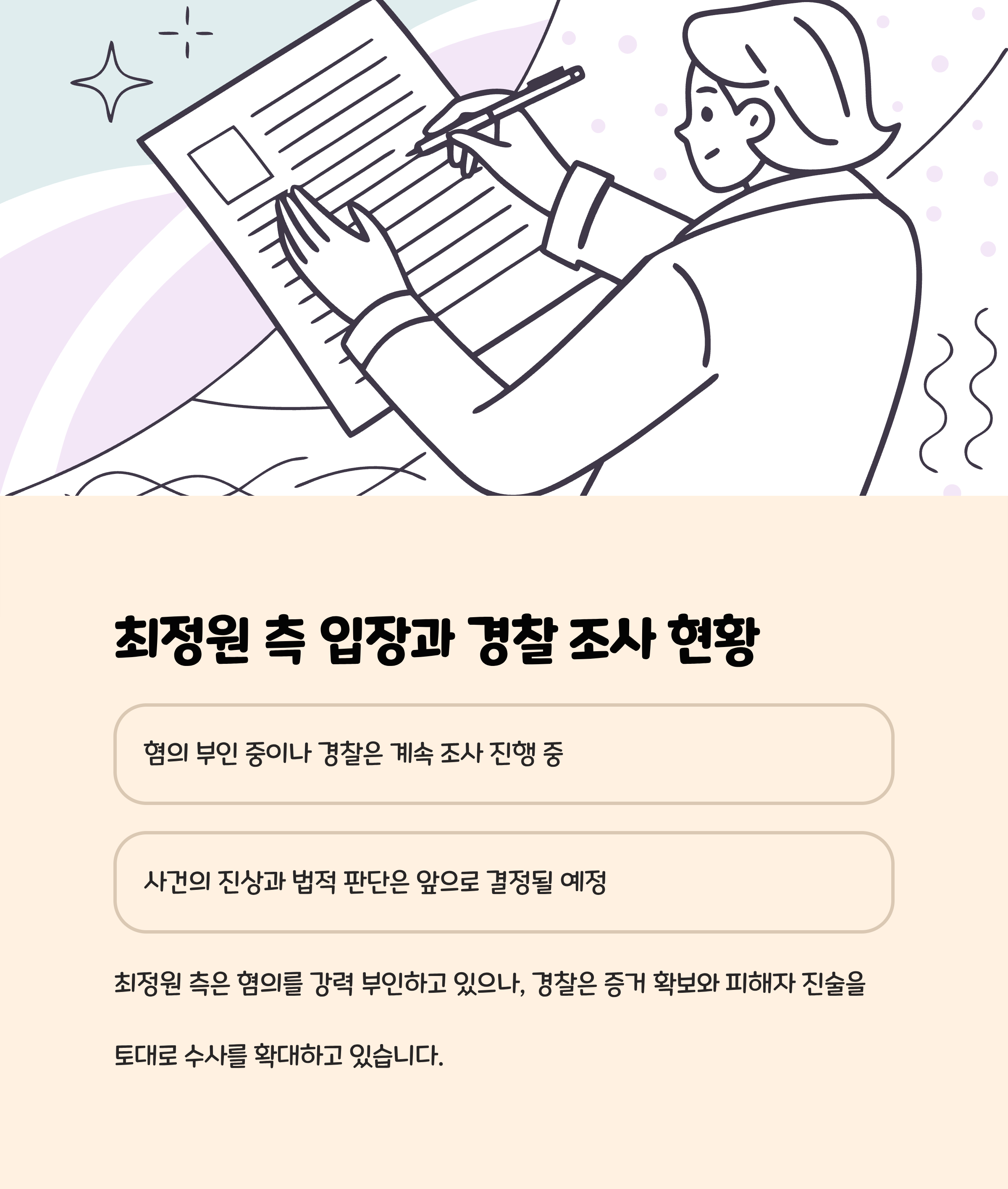 최정원 측은 혐의를 부인하며 “경찰 조사를 받았지만 스토킹이나 흉기 사용은 사실이 아니다”라는 입장을 밝혔습니다. 수사는 아직 진행 중입니다.
