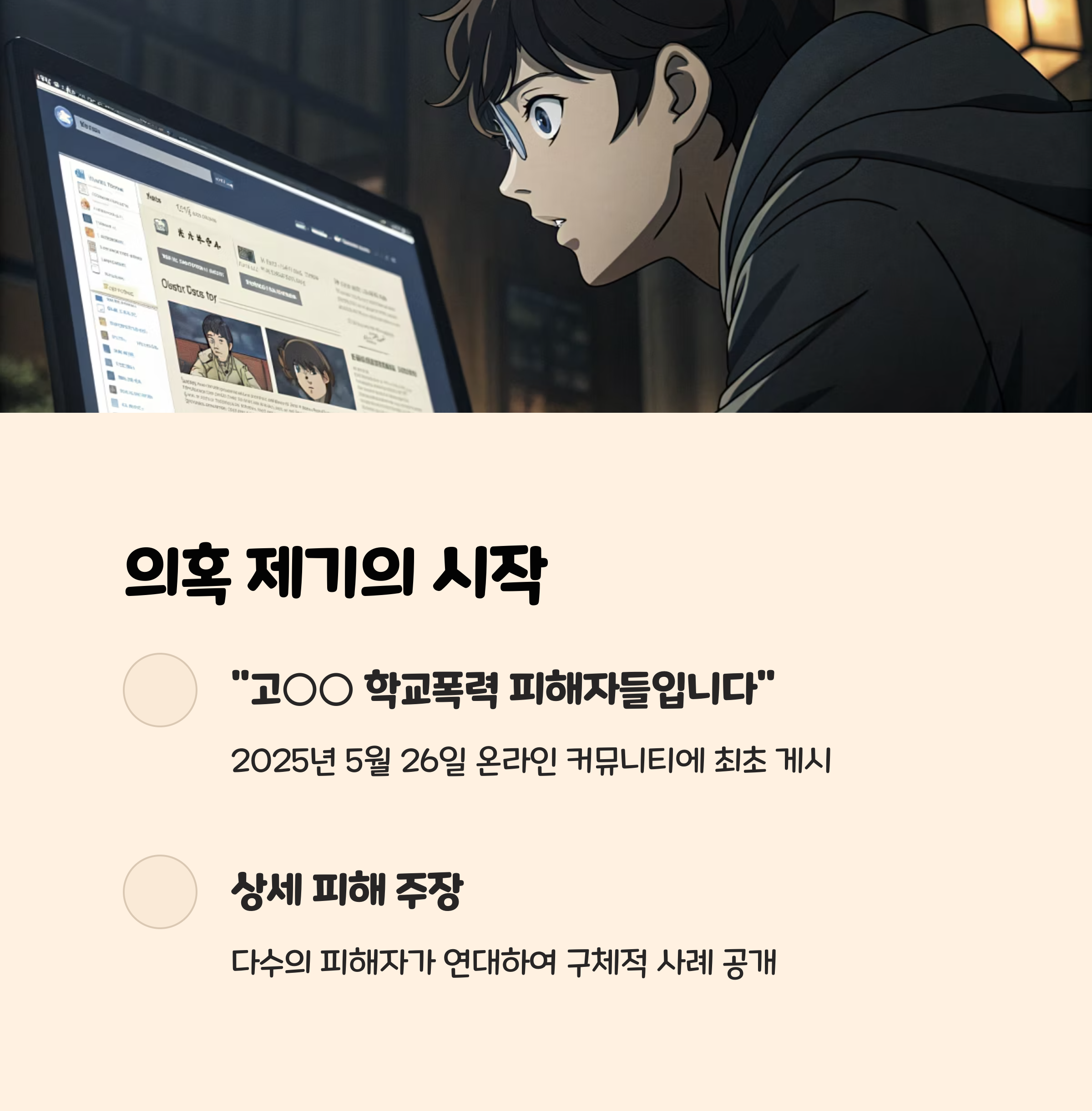 2025년 5월 26일, 한 온라인 커뮤니티에 ‘배우 고○○ 학폭 피해자들입니다’라는 제목의 글이 올라오면서 논란이 시작됐습니다. 작성자는 고민시의 중학교 시절을 지목하며 금품 갈취, 폭언, 장애 학생 조롱, 협박, 절도 등 심각한 비위 행위를 구체적으로 폭로했습니다. 특히 “주변 일진 무리와 외부 인물까지 동원해 학교폭력을 일삼았다”는 주장과 함께, “사과나 보상도 원치 않으며, 연예계 활동 중단을 바란다”는 강경한 요구까지 담겼습니다.