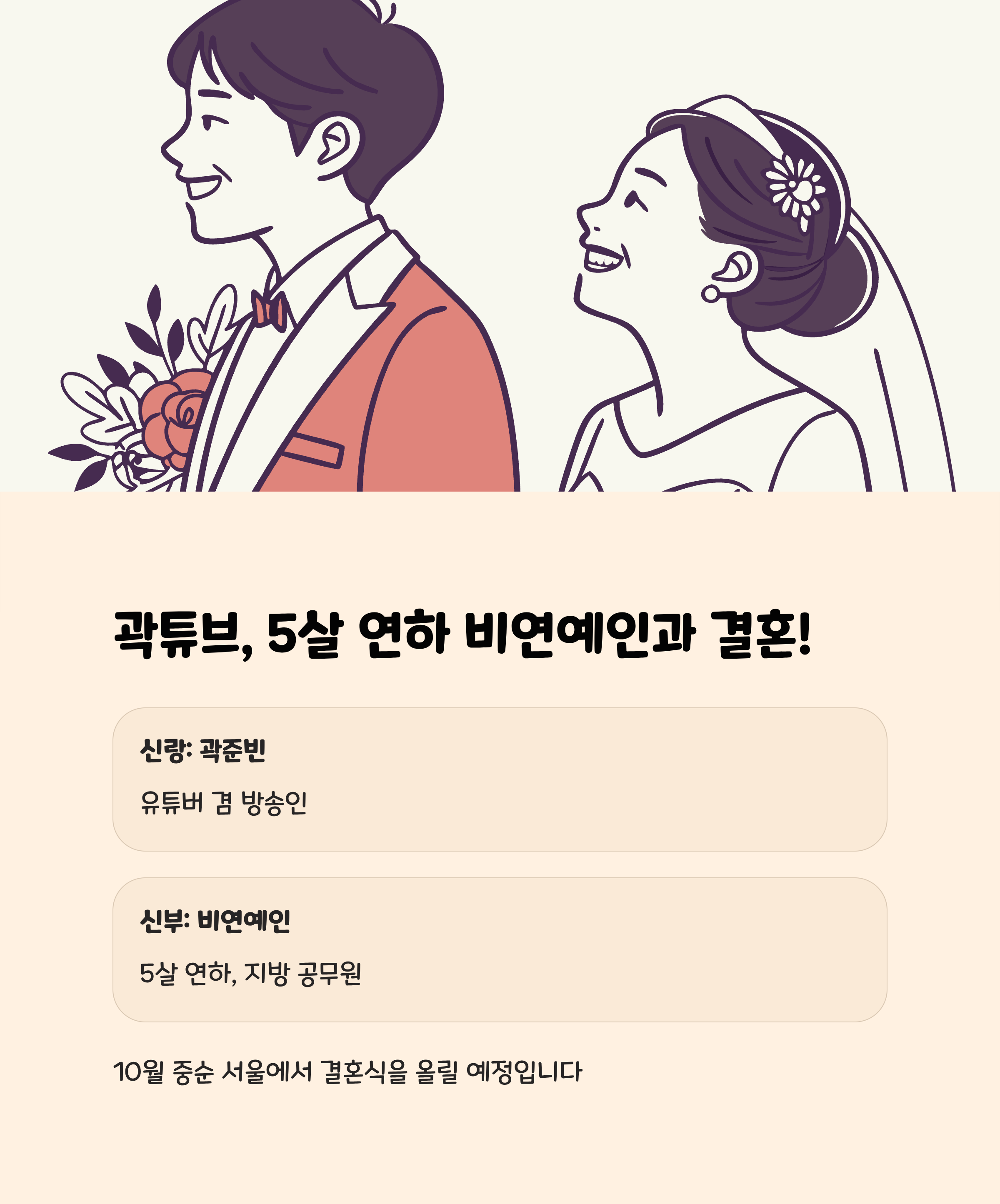 예비신부는 곽튜브보다 5살 어린 지방 근무 공무원(만 28세)으로, 비연예인 직장인으로 확인되었습니다.- 두 사람은 곽튜브가 유명세를 얻기 전 만났다가 이별, 이후 재회하여 신뢰와 애정을 쌓았으며 장거리 연애를 이어왔습니다.