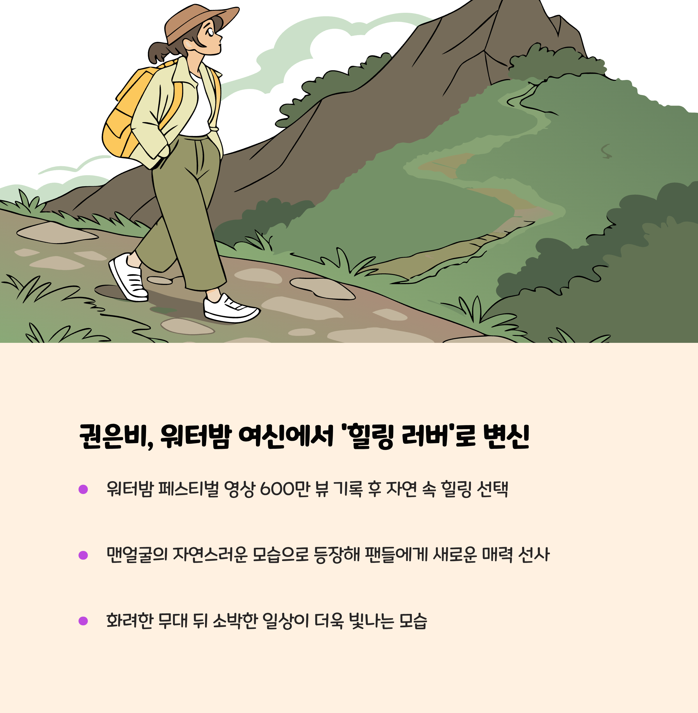 ‘워터밤 여신’으로 불릴 정도로 강렬한 무대 위 이미지와 달리, 금정산 고당봉(해발 801.5m) 정상에서는 맨얼굴과 편안한 차림으로 자연을 만끽한 권은비의 모습은 반전 그 자체였습니다. 특히 서로의 부드러운 표정과 브이(V) 포즈, 크루와 어울리는 장면은 한여름 산속의 싱그러움을 그대로 전했습니다.