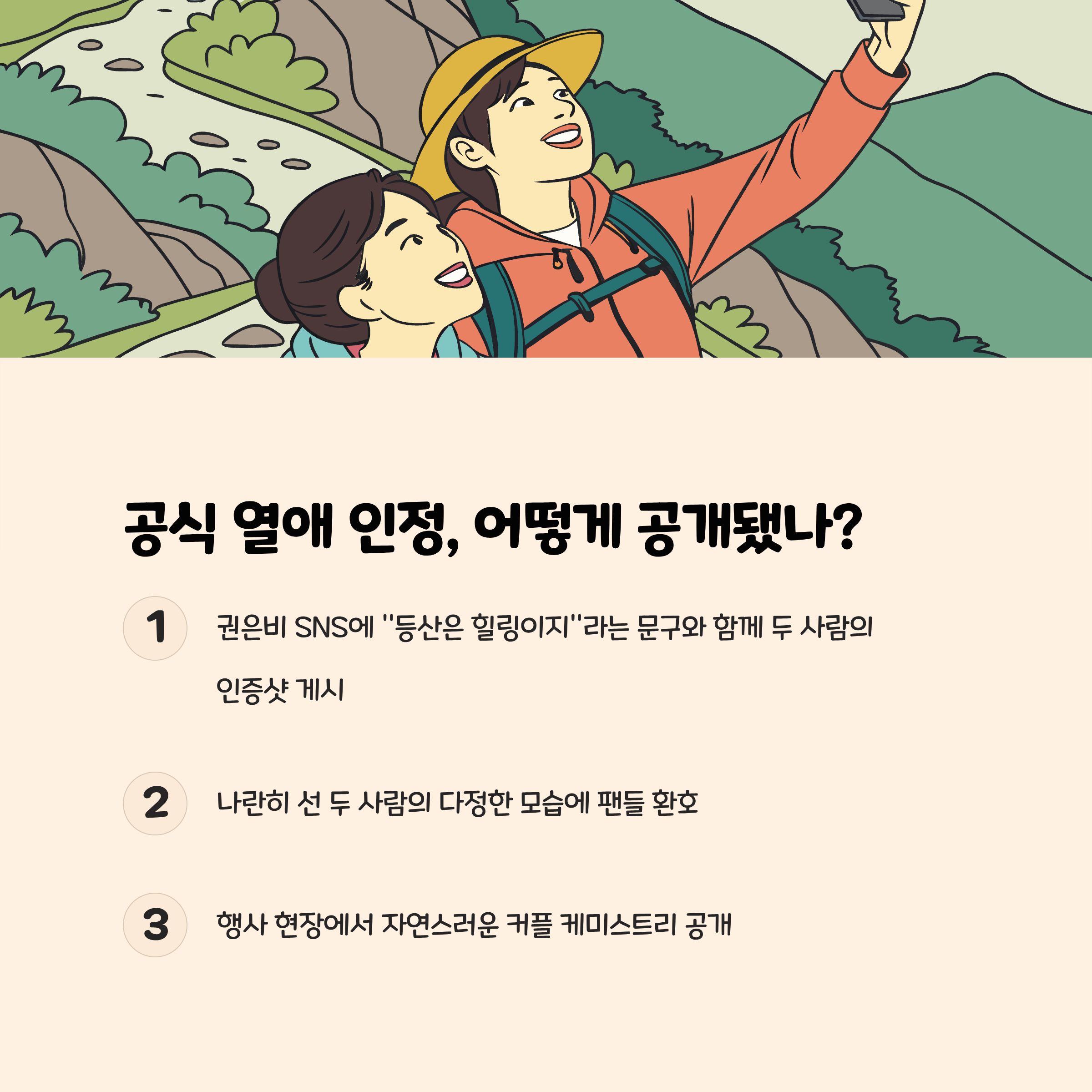 권은비는 2014년 데뷔 이후 아이즈원과 솔로 아티스트로 화려한 커리어를 쌓아온 가수이며, 빠니보틀은 247만 명의 구독자를 거느린 인기 여행 크리에이터로 다양한 예능과 자체 콘텐츠에서 활약 중입니다. 두 사람은 지난 7월 부산 금정산에서 열린 스포츠 브랜드(아이더샬레)의 등반 행사에서 동행하며 관계를 공식화했죠.