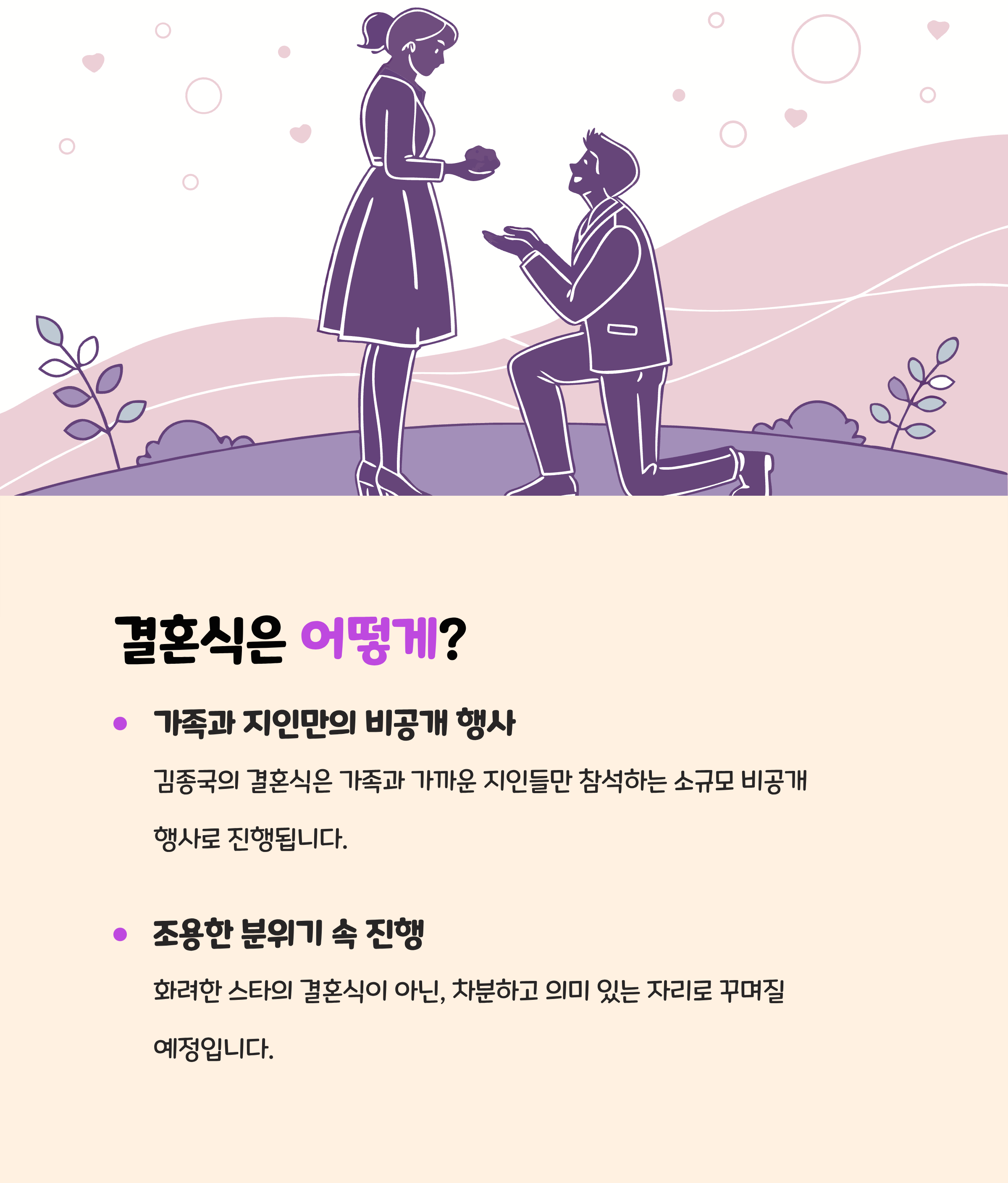 김종국 소속사와 본인은 “예비 신부는 비연예인으로, 자세한 신상 정보는 공개하지 않겠다”고 밝혔습니다. 김종국은 팬카페 자필 편지에서 “올해 데뷔 30주년이기도 한데 앨범 대신 반쪽을 만들게 됐다”며 결혼 사실을 직접 알렸습니다. 결혼식은 가족과 가까운 지인만 참석하는 비공개 형태로 조용히 진행될 예정입니다.