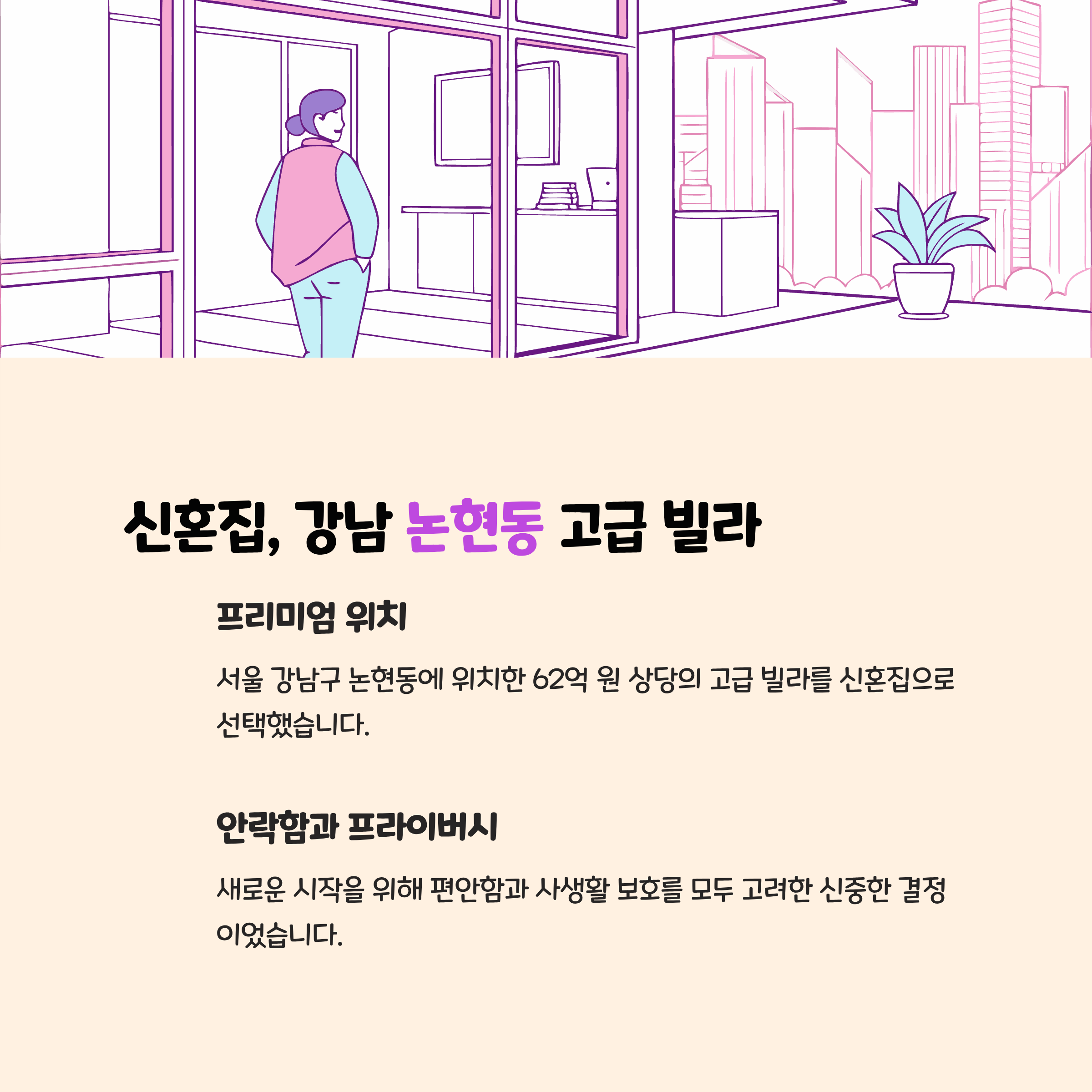| 신혼집 위치 및 가격 | 서울 강남구 논현동, 62억 원 빌라 | 언론 보도 |