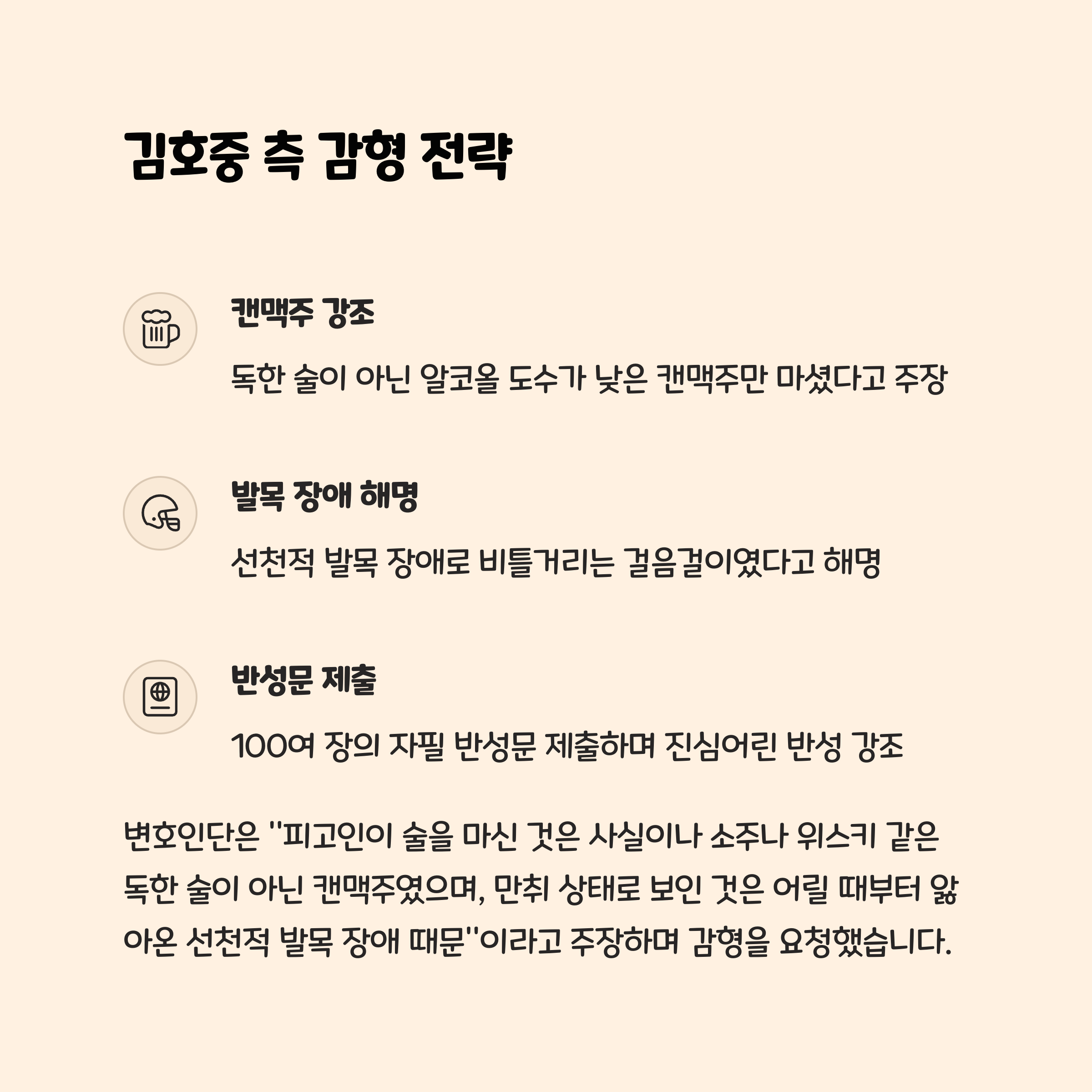 술타기는 보통 독한 술을 마셔 혈중알코올농도를 높여 음주 측정을 방해하는 행위라고 알려져 있습니다. 김호중 씨는 매니저가 대신 자수할 것이라 생각해 본인이 직접 음주 측정을 받을 준비가 되어 있지 않았다고 설명하고 있습니다. 캔맥주를 마신 점은 술타기 의도가 없음을 뒷받침하는 부분이라고 주장하고 있습니다. 선천적 발목 기형으로 인한 보행 장애가 음주 상태 과장에 영향을 미쳤다고도 강조하고 있습니다.