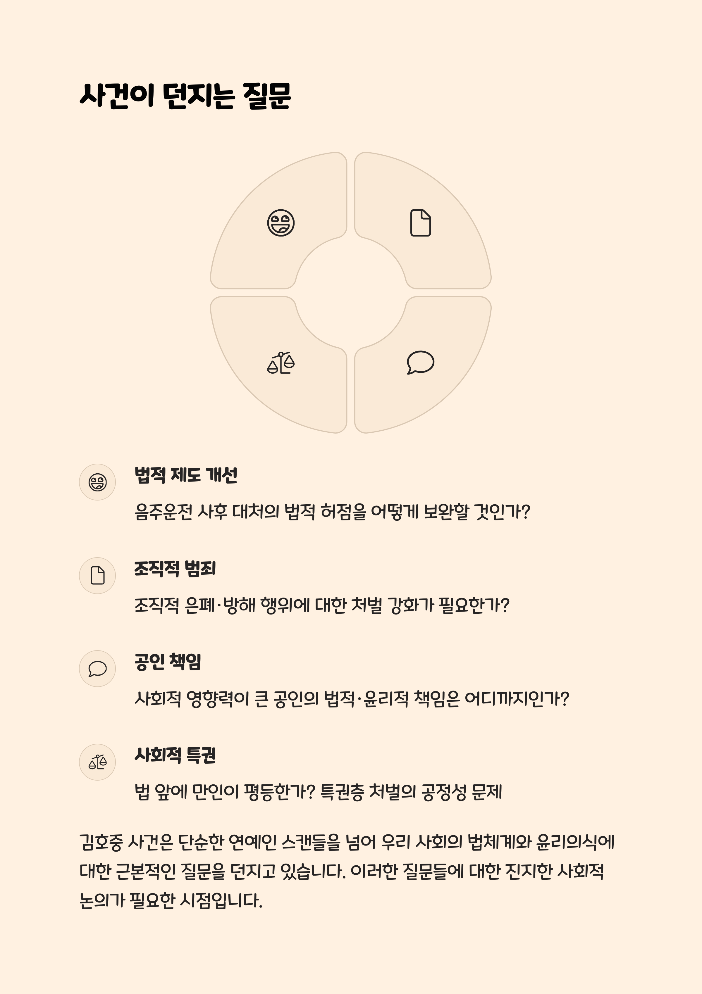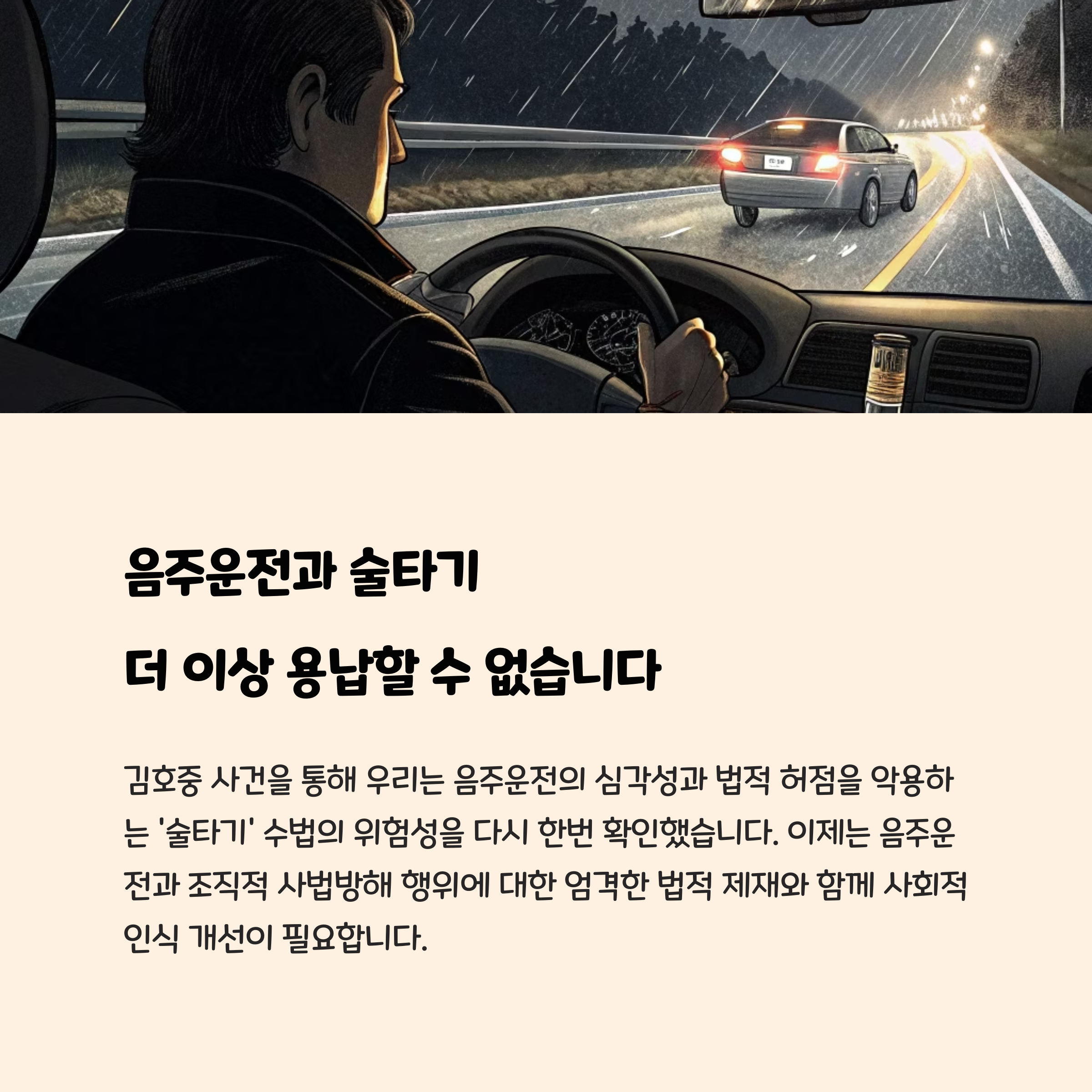 김호중 씨 음주운전 사건은 ‘술타기 수법’ 부인과 감형 시도라는 법적 쟁점을 중심으로 사회적 논란을 불러일으키고 있습니다. 이 사건은 음주운전 단속의 허점을 악용하는 행위에 대한 법적 처벌 강화 필요성을 환기시키며, 향후 관련 법률 개정과 사회 인식 개선에 중요한 영향을 미칠 것으로 보입니다. 음주운전은 개인과 사회 모두에 심각한 위험을 초래하는 범죄임을 인식하고, 법적·사회적 대응이 함께 이루어져야 할 사안이라고 생각합니다.