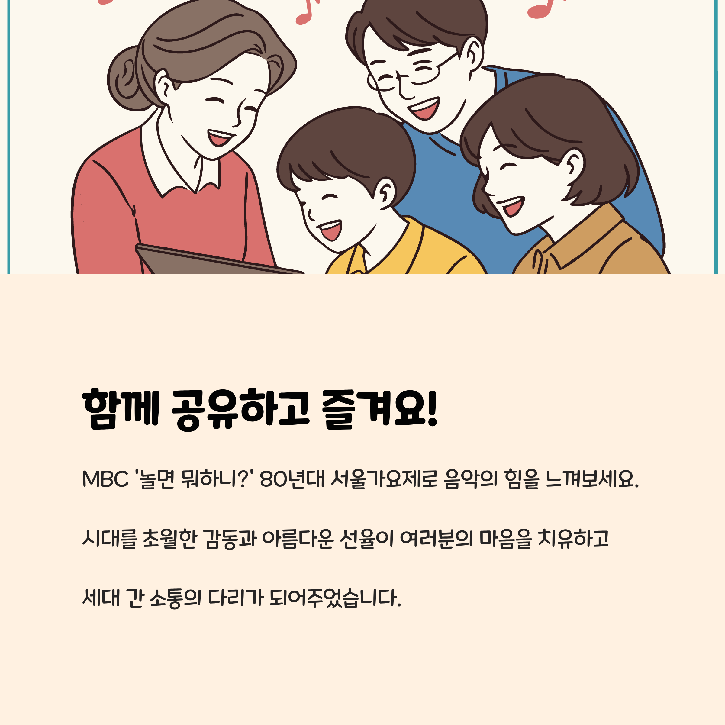 1980년대 음악은 3040세대엔 학창시절과 성장 배경의 기억으로, MZ세대에는 신선한 레트로 문화로 다가옵니다. 이 시기의 히트곡들은 감성적인 가사와 멜로디가 세대를 넘어선 공감 포인트로 자리 잡아, 음악을 매개로 세대 통합에 최적의 소재라 판단했습니다.