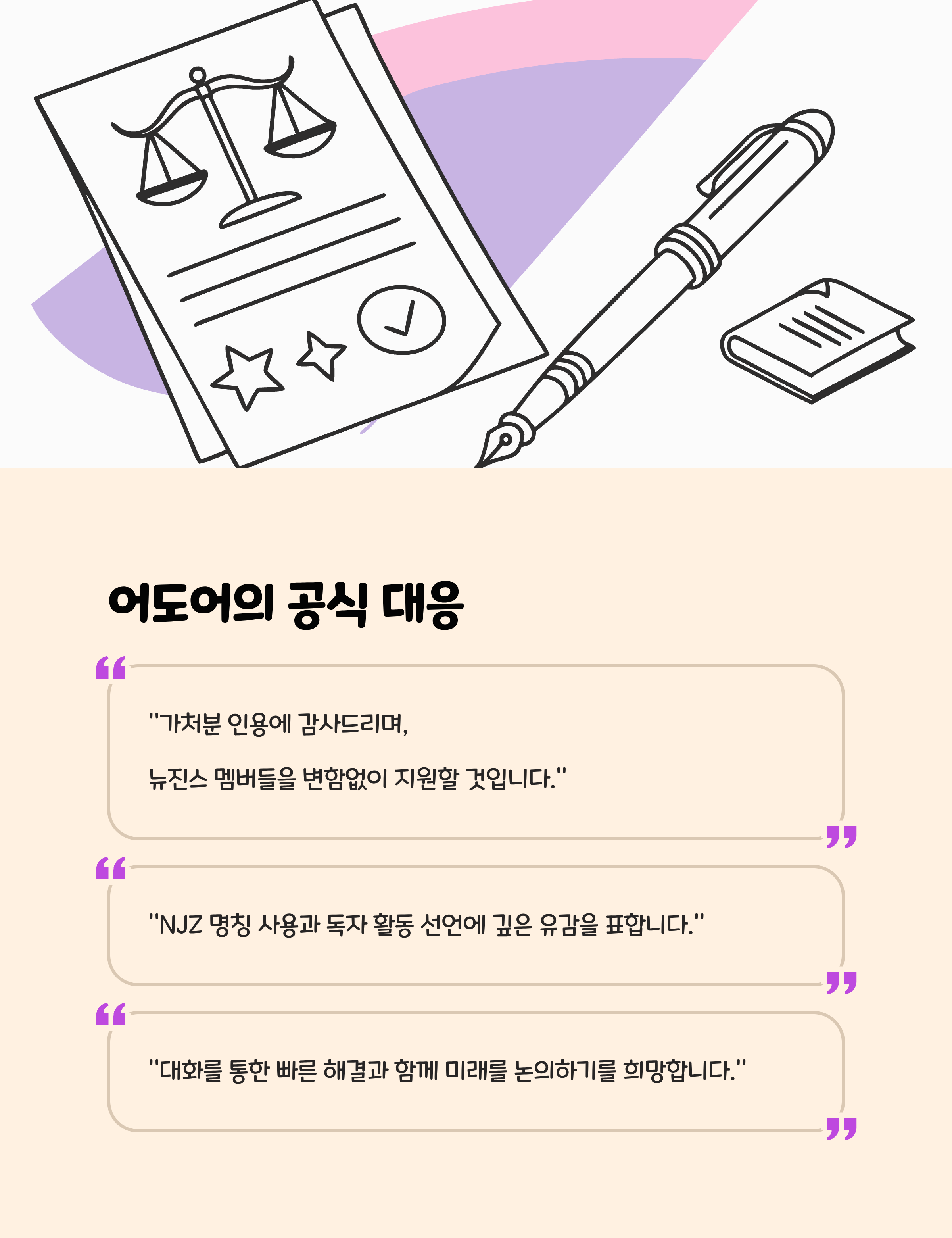 어도어는 회사 운영상의 인사 변동은 계약 해지 사유가 되지 않는다고 주장합니다. 오히려 뉴진스 측이 일방적으로 계약을 파기하려 했다고 보고, 전속계약 유지를 위해 법적 대응을 이어가고 있습니다.
