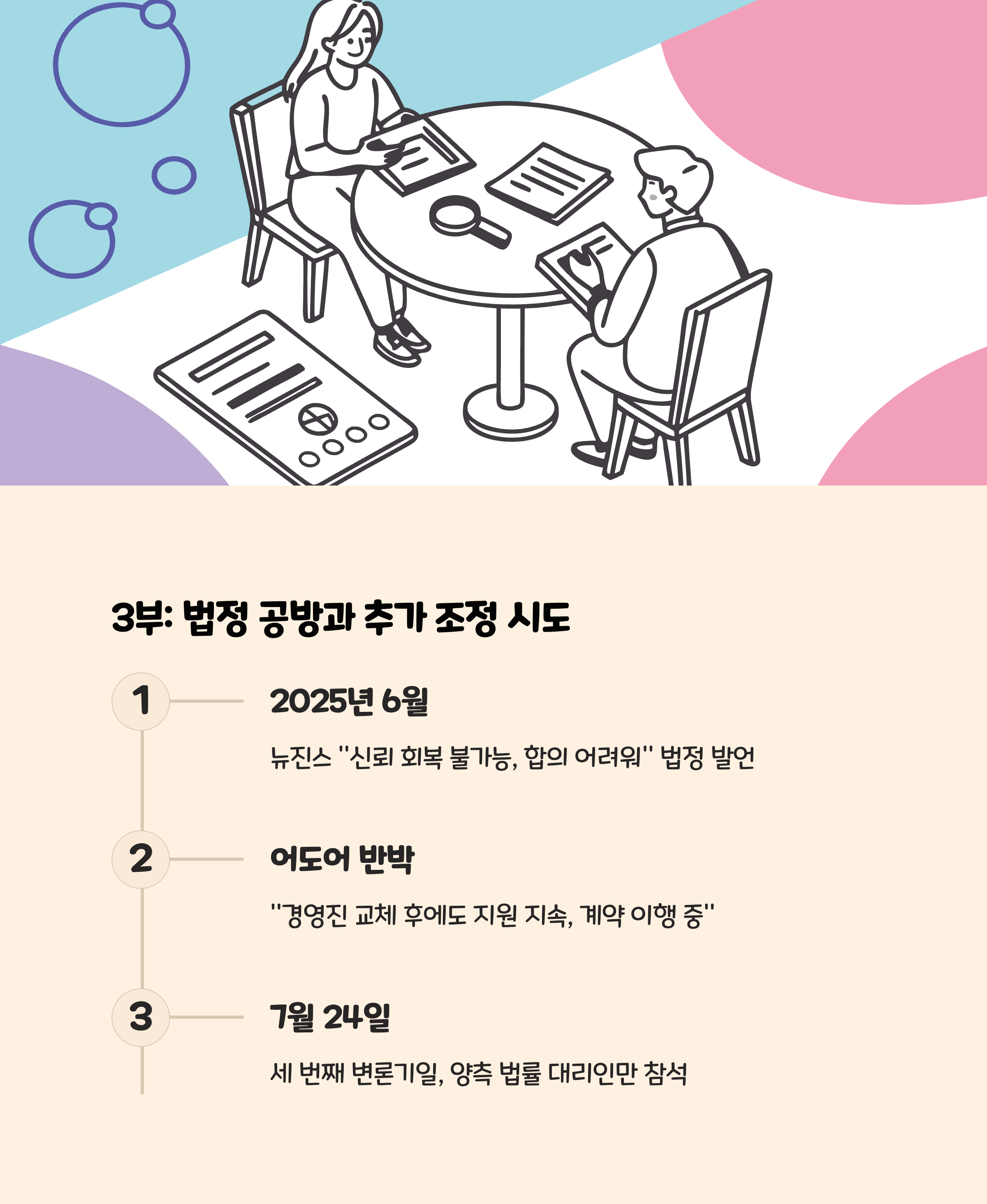 재판부는 2025년 9월 11일에 추가 조정 기일을 잡았습니다. 이 자리에서 합의가 이루어지지 않으면 사건은 정식 재판으로 넘어가 10월 30일 판결이 선고될 예정입니다.