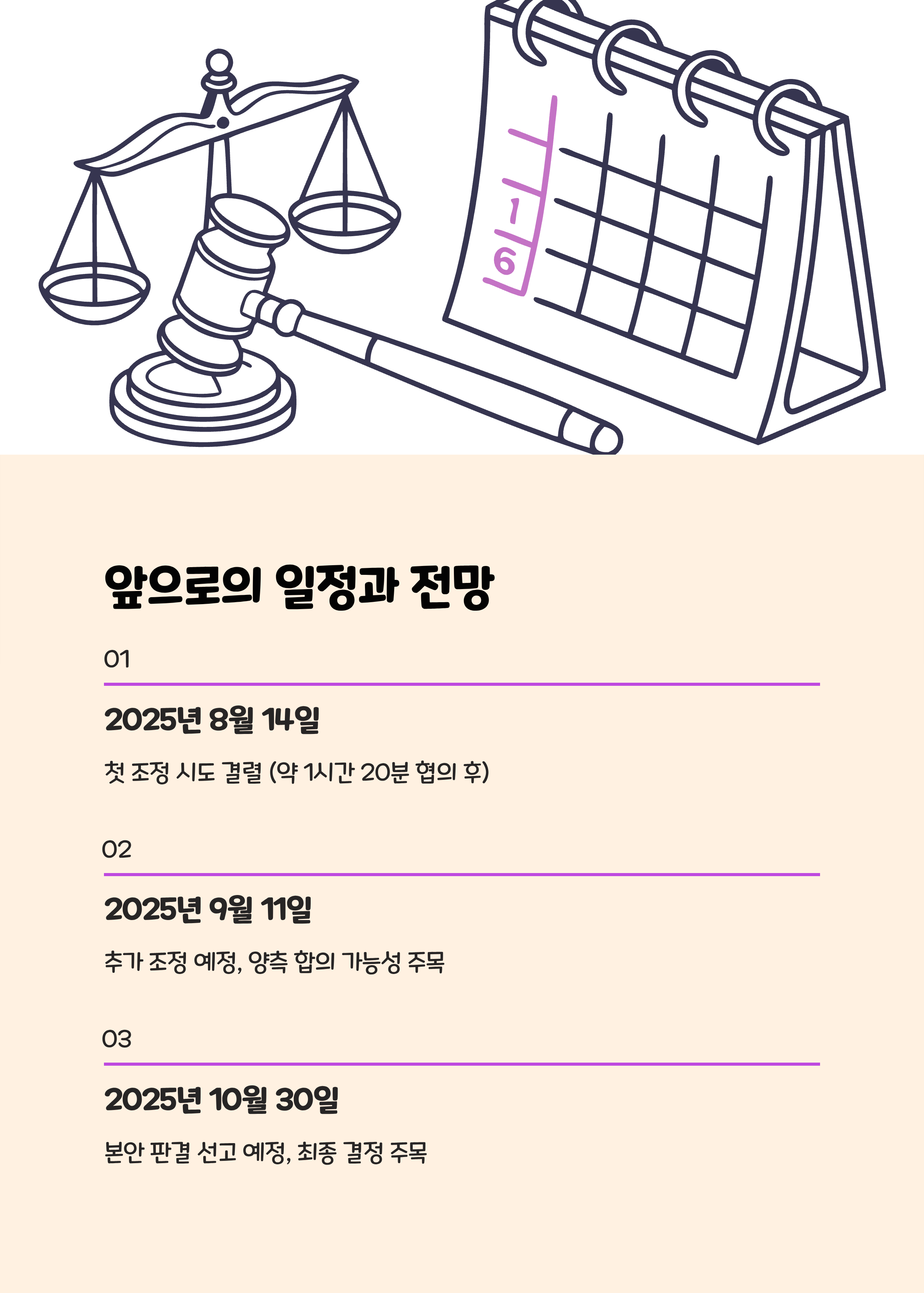 법원은 재판상 화해와 유사한 조정 절차를 통해 양측의 자발적 해결을 유도하고 있으나, 이번 14일 조정에 이어 9월 11일 추가 조정 기일에서도 합의가 이루어지지 않을 경우, 10월 30일 정식 판결 선고로 사안이 마무리될 전망입니다.