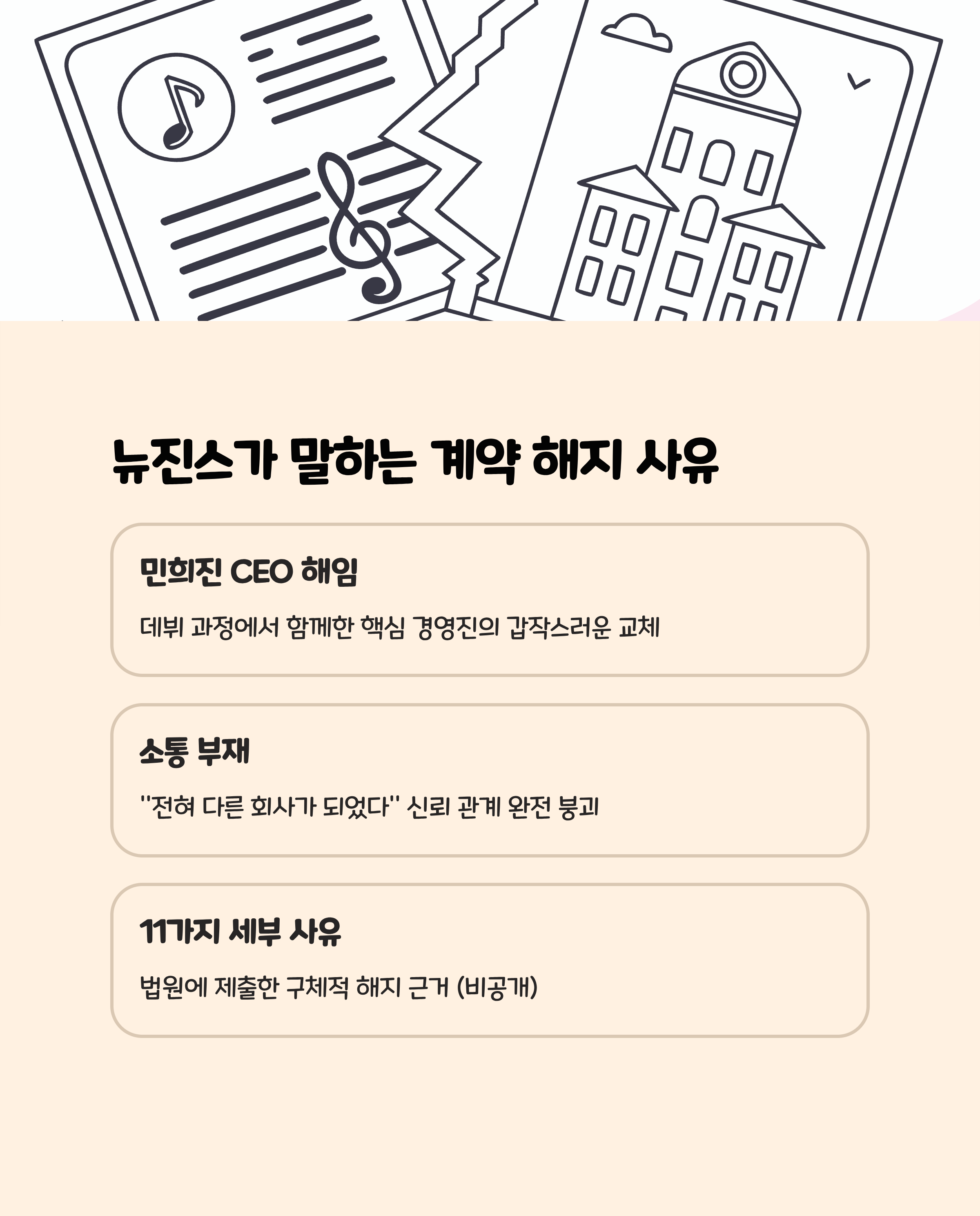신뢰 관계 파탄이란 계약 당사자 간의 근본적 믿음이 무너져 계약 목적 달성이 불가능한 상태를 말합니다. 뉴진스는 민희진 전 대표의 퇴진과 소속사 경영진 변화가 자신들의 활동에 큰 영향을 미쳤다고 주장합니다.