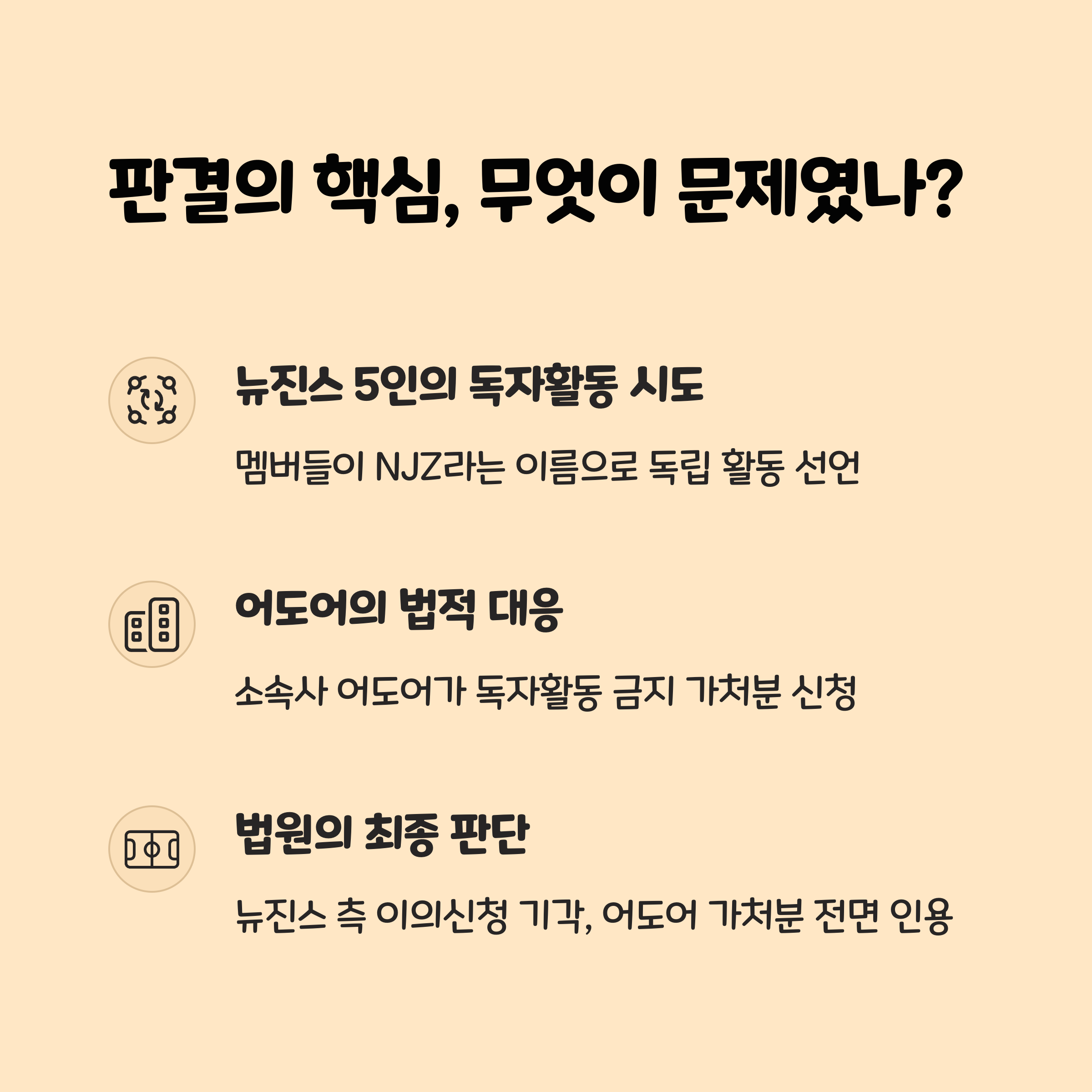 뉴진스 멤버들은 2024년 11월, 어도어에 전속계약 해지를 통보한 뒤, ‘NJZ’라는 새 팀명으로 공식 소셜미디어 계정을 개설하고 홍콩 컴플렉스콘 등에서 독자 활동을 이어갔습니다. 이에 어도어는 “뉴진스가 독자적으로 광고 계약이나 연예 활동을 할 수 없게 해 달라”며 법원에 가처분을 신청했고, 법원은 이를 전부 인용했습니다.
