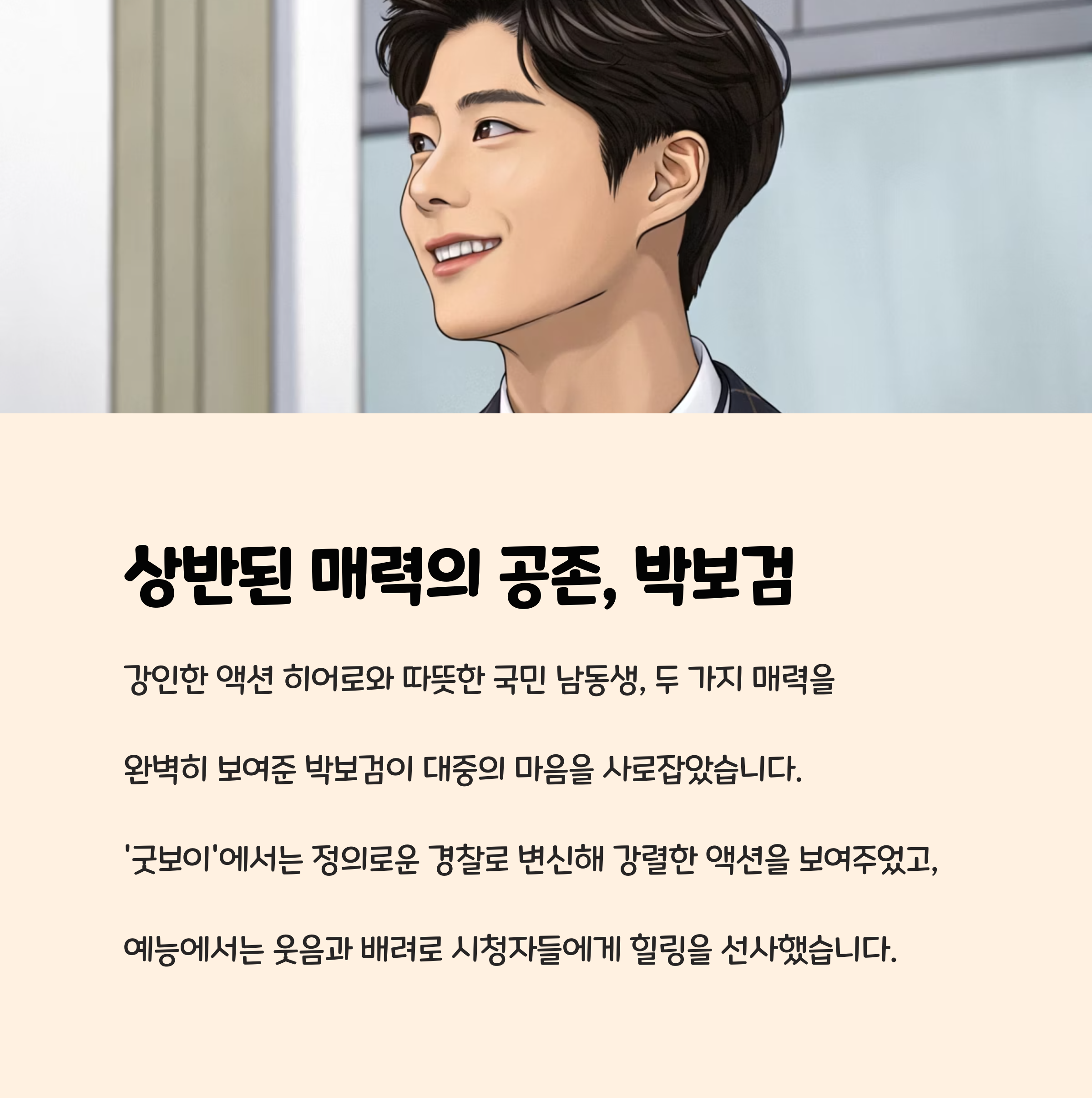 박보검은 ‘굿보이’의 불도저 경찰 윤동주로서 강렬한 카리스마와 정의감을, ‘1박 2일’에서는 인간적인 따뜻함과 솔직함을 동시에 보여주며 대중의 마음을 사로잡고 있습니다. 두 작품 모두에서 박보검의 진정성, 노력, 그리고 변화에 대한 두려움 없는 도전정신이 돋보입니다. 이런 박보검의 다채로운 매력이야말로 그를 시대의 아이콘으로 만든 원동력임을 다시 한번 확인할 수 있습니다.