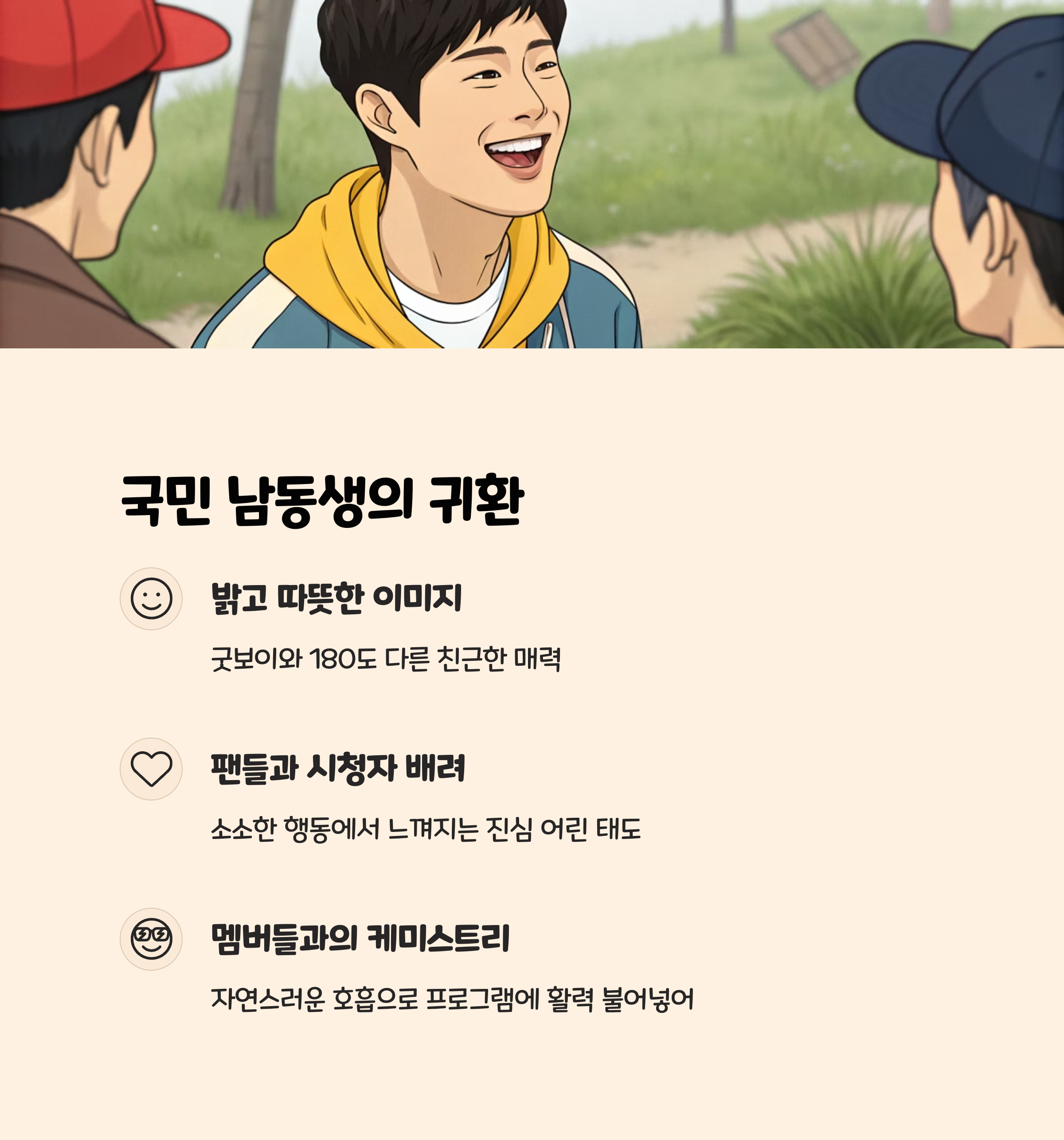 - 누구와도 자연스럽게 어울리며, 국민 남동생 이미지를 굳혔습니다.