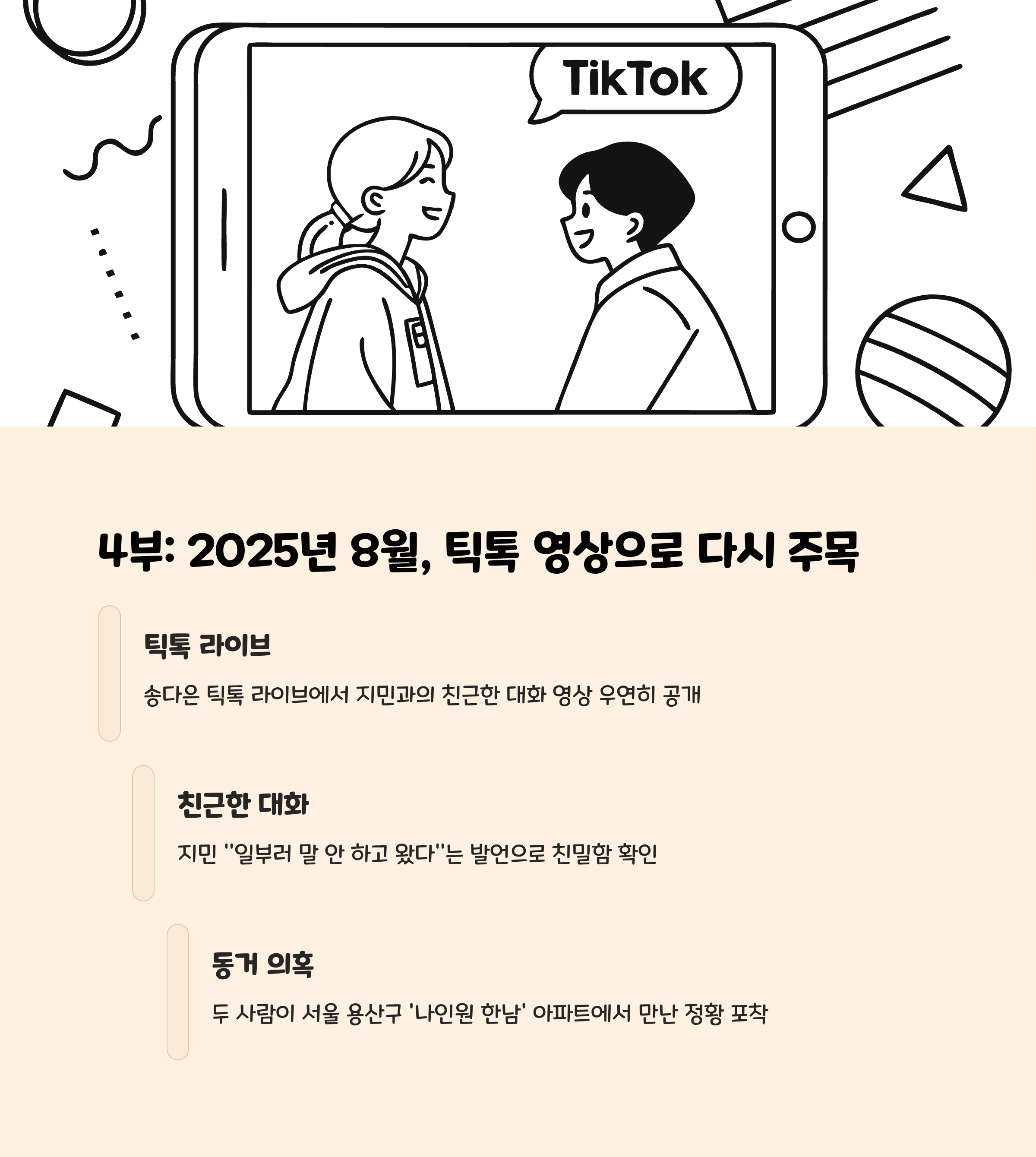 - 2025년 8월 26일, 송다은 씨의 틱톡 계정에 지민 씨가 등장하는 아파트 복도 영상이 올라와 큰 화제가 되었습니다.