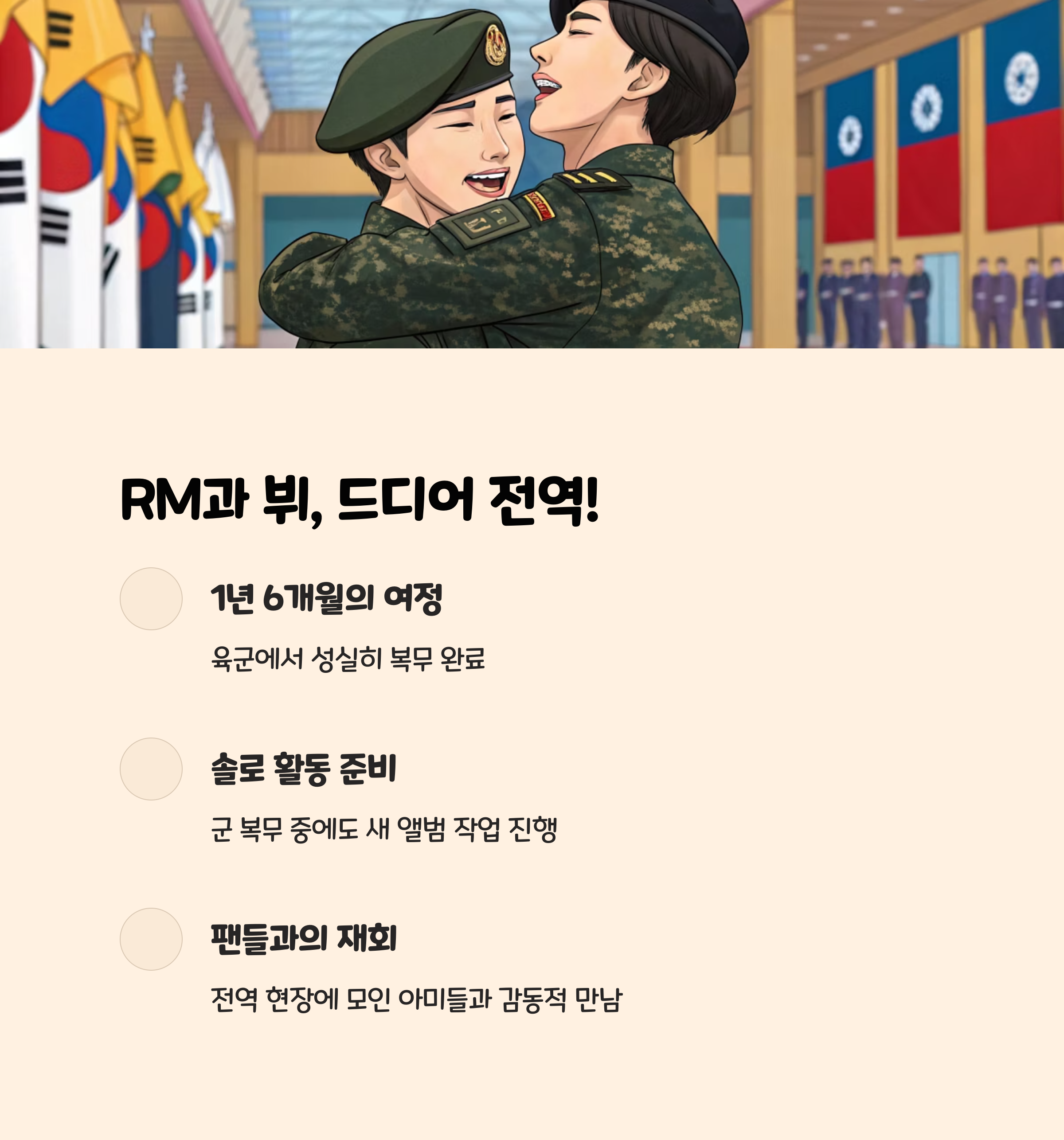 전역 당일, RM과 뷔는 강원 춘천시 신북읍체육공원에서 팬들과 취재진 앞에 모습을 드러냈습니다. RM은 선글라스를 끼고 색소폰으로 ‘명탐정 코난’ OST를 연주하며 등장했고, 뷔는 꽃다발을 들고 환한 미소로 팬들에게 인사했습니다. 두 사람은 서로 포옹하며 전역을 축하했고, 현장에는 국내외 아미 수백 명이 모여 응원했습니다.