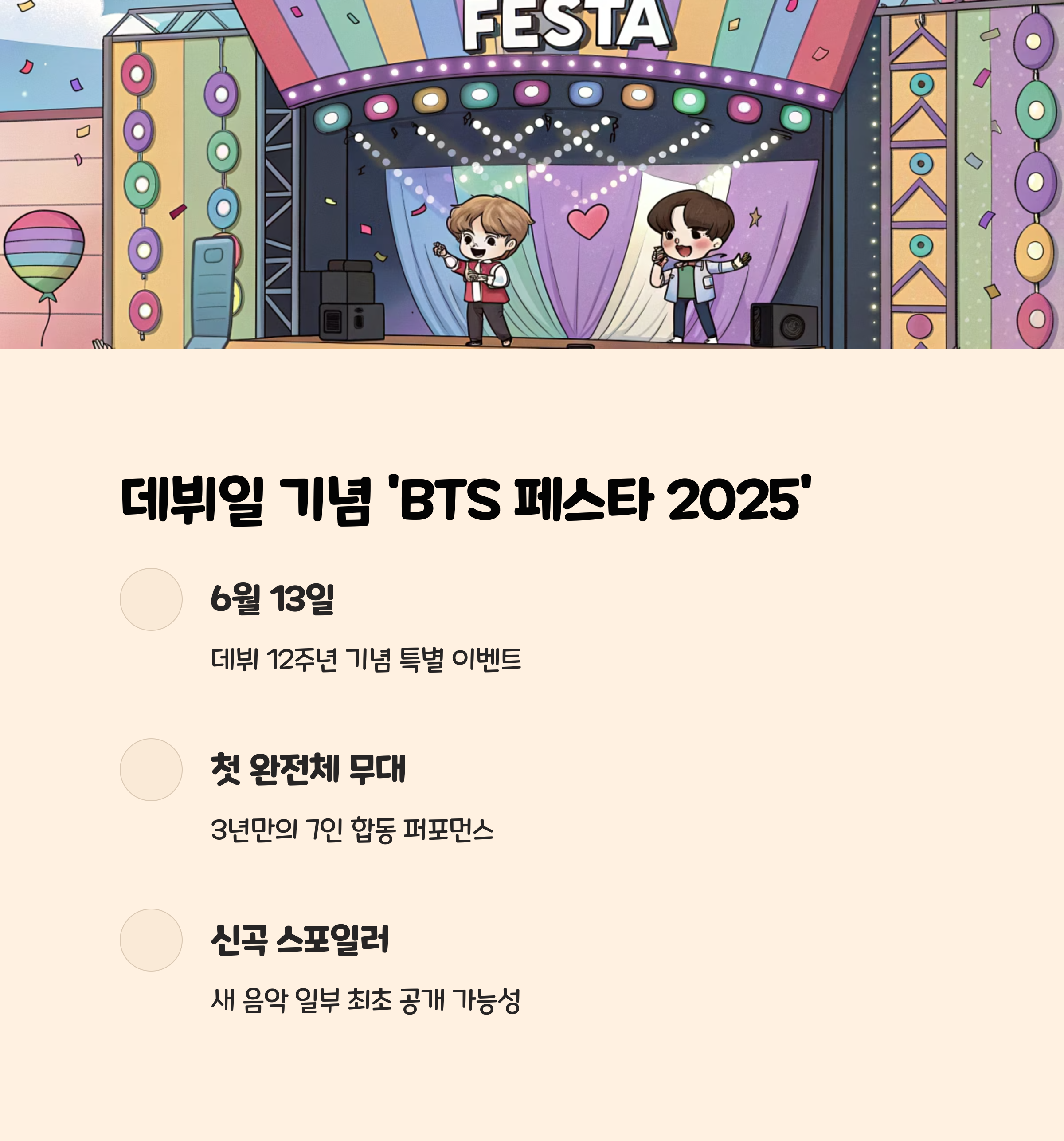 6월 13일 BTS 데뷔일을 기념하는 ‘BTS 페스타’가 전역 후 첫 공식 일정입니다. 이 자리에서 멤버들이 팬들과 직접 소통하고, 새로운 소식이나 무대를 공개할 가능성이 높아 팬들의 관심이 집중되고 있습니다.