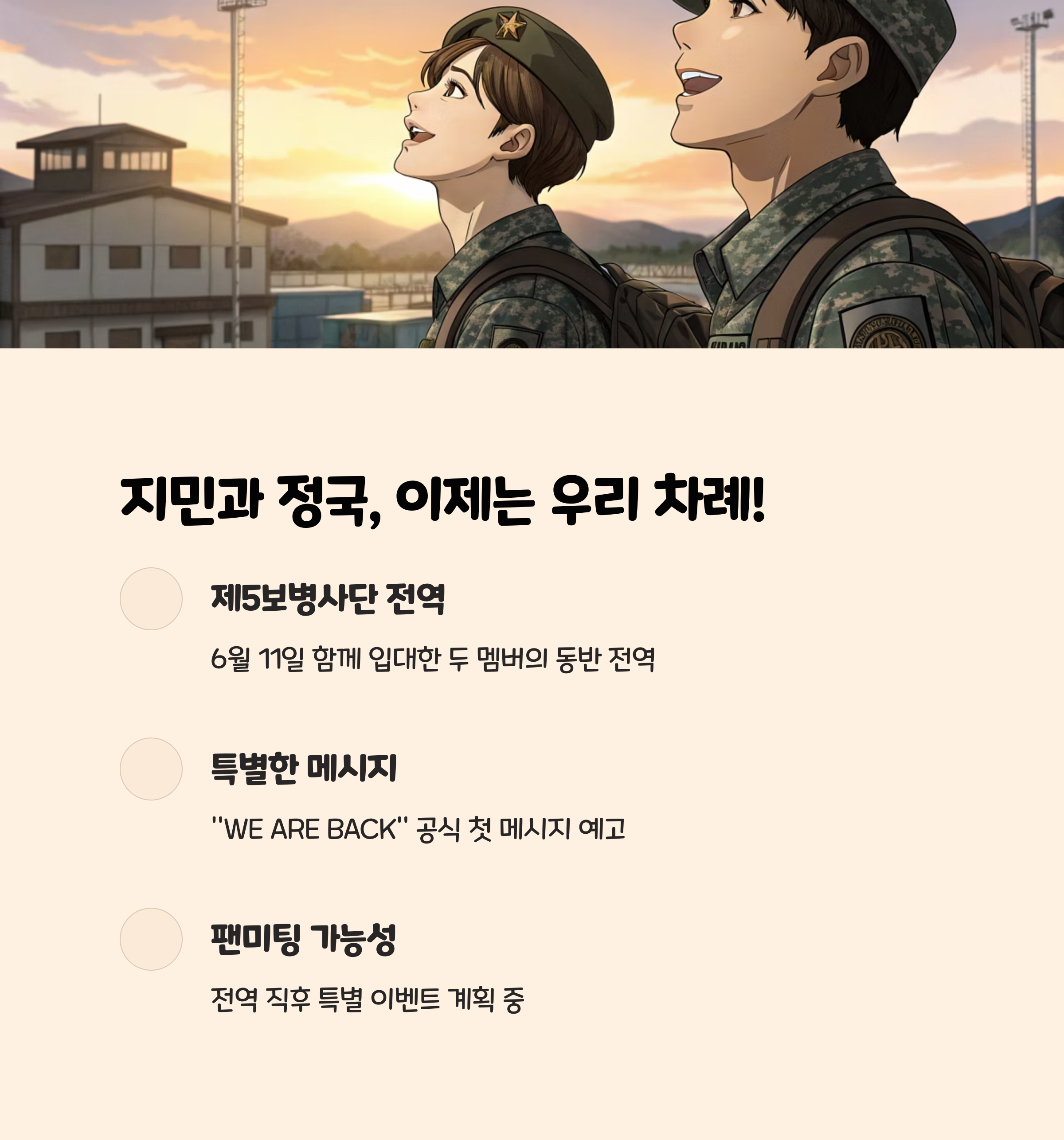 지민과 정국은 2023년 12월 5사단 신병교육대에 동반 입소해 18개월간 복무를 마치고 전역했습니다. 별도의 공식 행사는 없었지만, 이들의 전역 소식은 전 세계 팬들에게 큰 화제가 됐습니다.