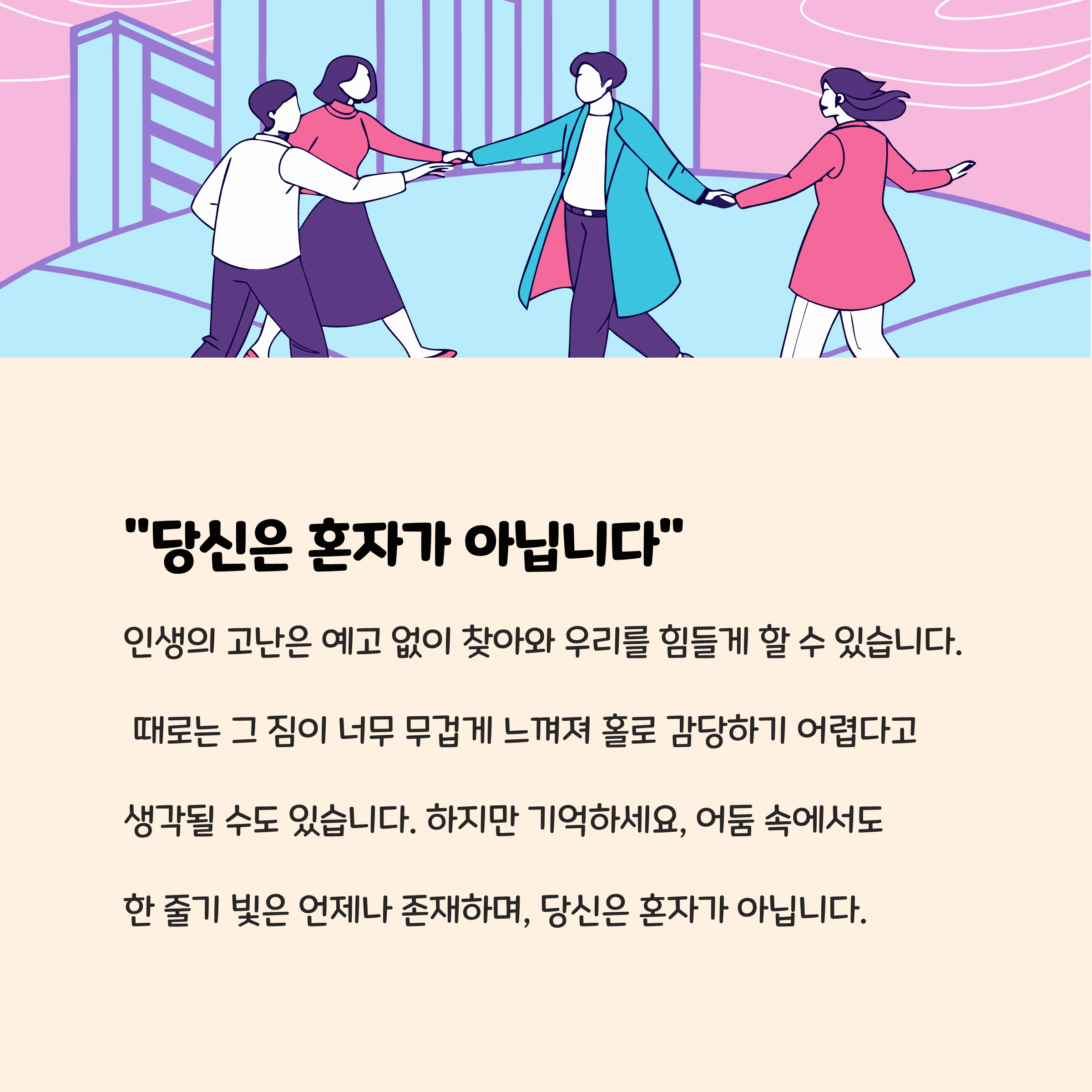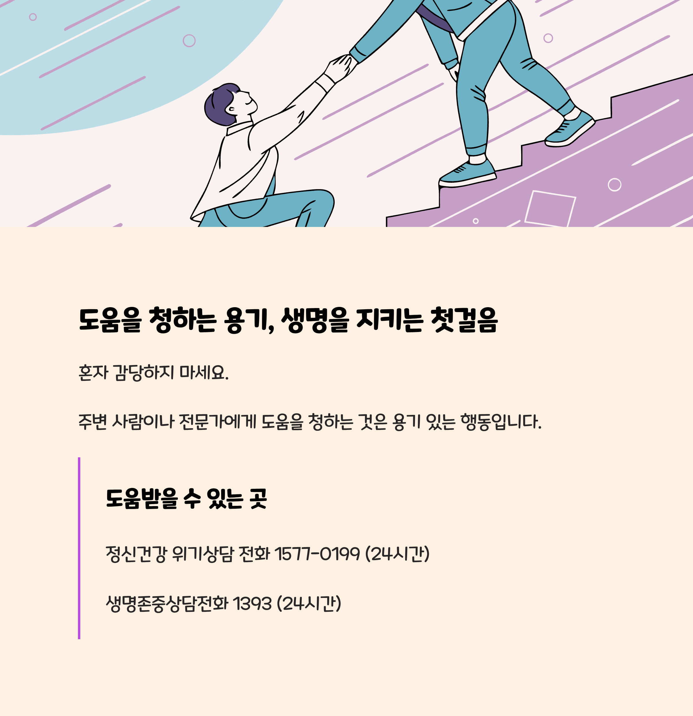 - 갑작스런 고민이나 불안이 있을 때는 꼭 24시간 상담창구(☎109 등)를 활용하세요.