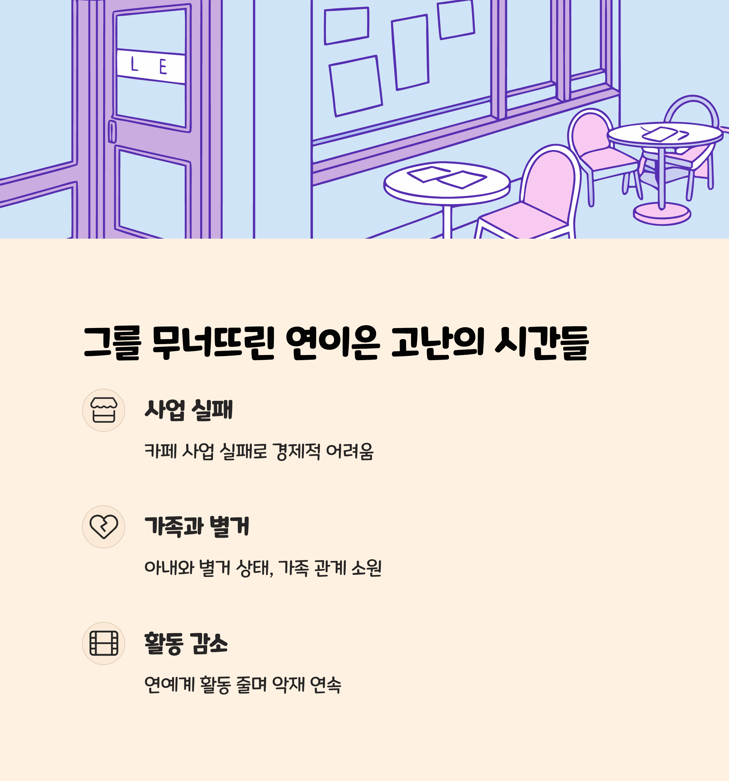 최근 사업 실패와 별거, 작품 수 감소 등 여러 악재가 겹쳤던 것으로 알려졌습니다. 아내가 운영하던 카페 사업까지 경기가 악화하며 경제적으로도 큰 어려움을 겪었고, 가족들과도 떨어져 지냈습니다. 가까운 이들은 "원래 스트레스가 많았던 데다, 음주운전 사건 이후 감당할 수 없는 부담과 막막함에 크게 괴로워했다"고 전했습니다.