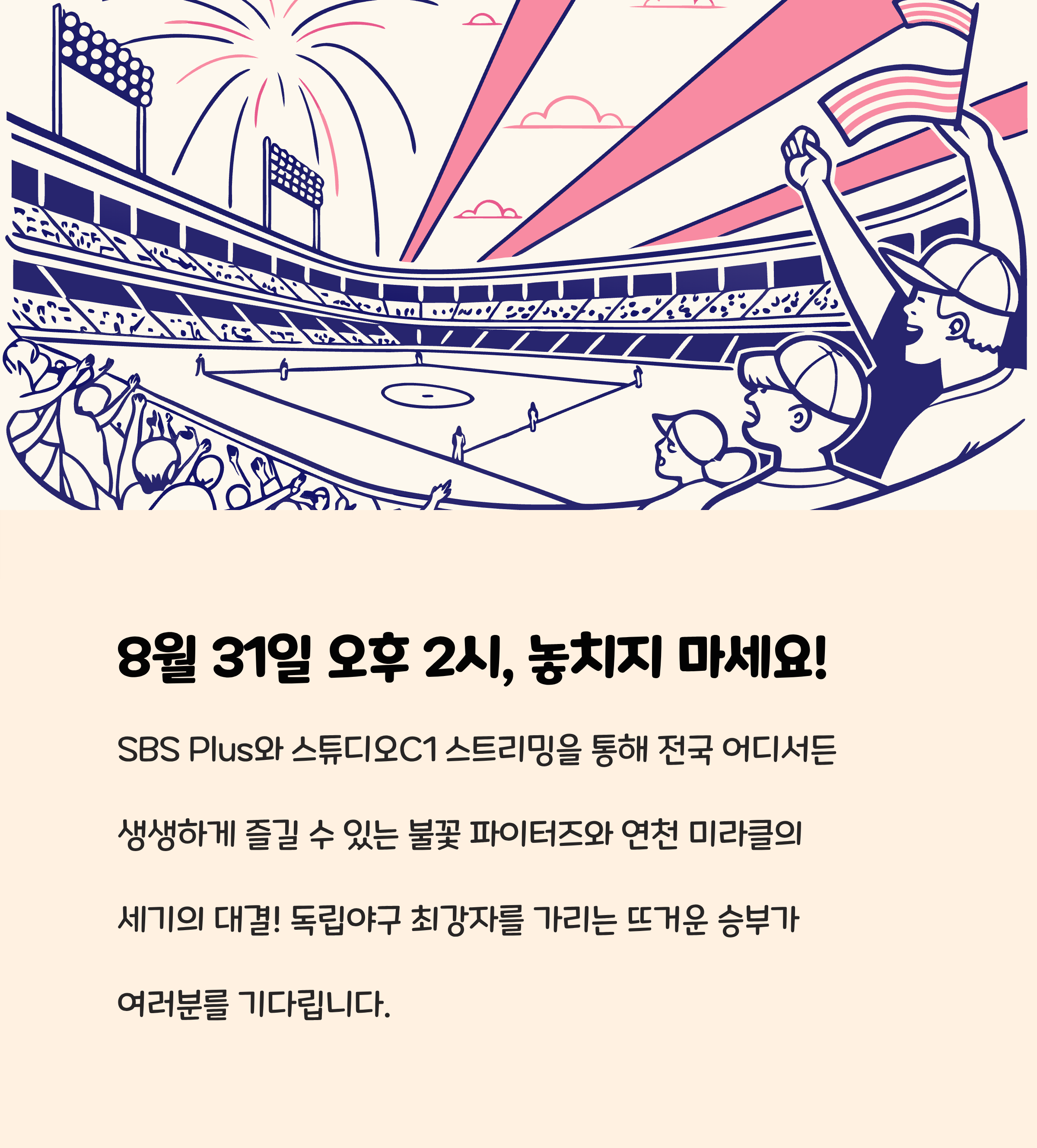 오는 8월 31일 오후 2시, SBS Plus 채널에서 ‘특집 야구 생중계 - 불꽃 파이터즈 vs 연천 미라클’ 경기가 방송됩니다. 이번 경기는 올 시즌 SBS Plus에서 선보이는 세 번째 불꽃야구 직관 생중계로, 야구팬들의 뜨거운 기대를 모으고 있습니다.
