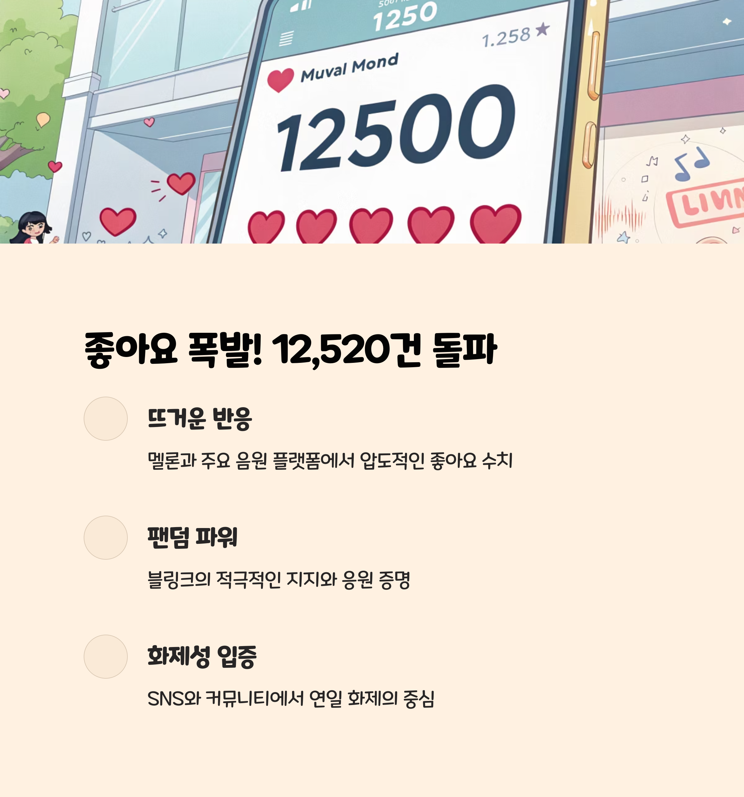 ‘뛰어(JUMP)’는 발매 직후 멜론을 비롯한 여러 음원 플랫폼에서 높은 스트리밍 수치를 기록하고 있습니다. 멜론 핫100 차트 기준, 좋아요 수 12,520건을 단기간에 달성하며 팬덤의 강력한 지지를 확인할 수 있습니다. 이는 동 시기 경쟁곡들과 비교해도 매우 높은 수치로, 블랙핑크의 글로벌 영향력을 다시 한번 입증하는 결과입니다.