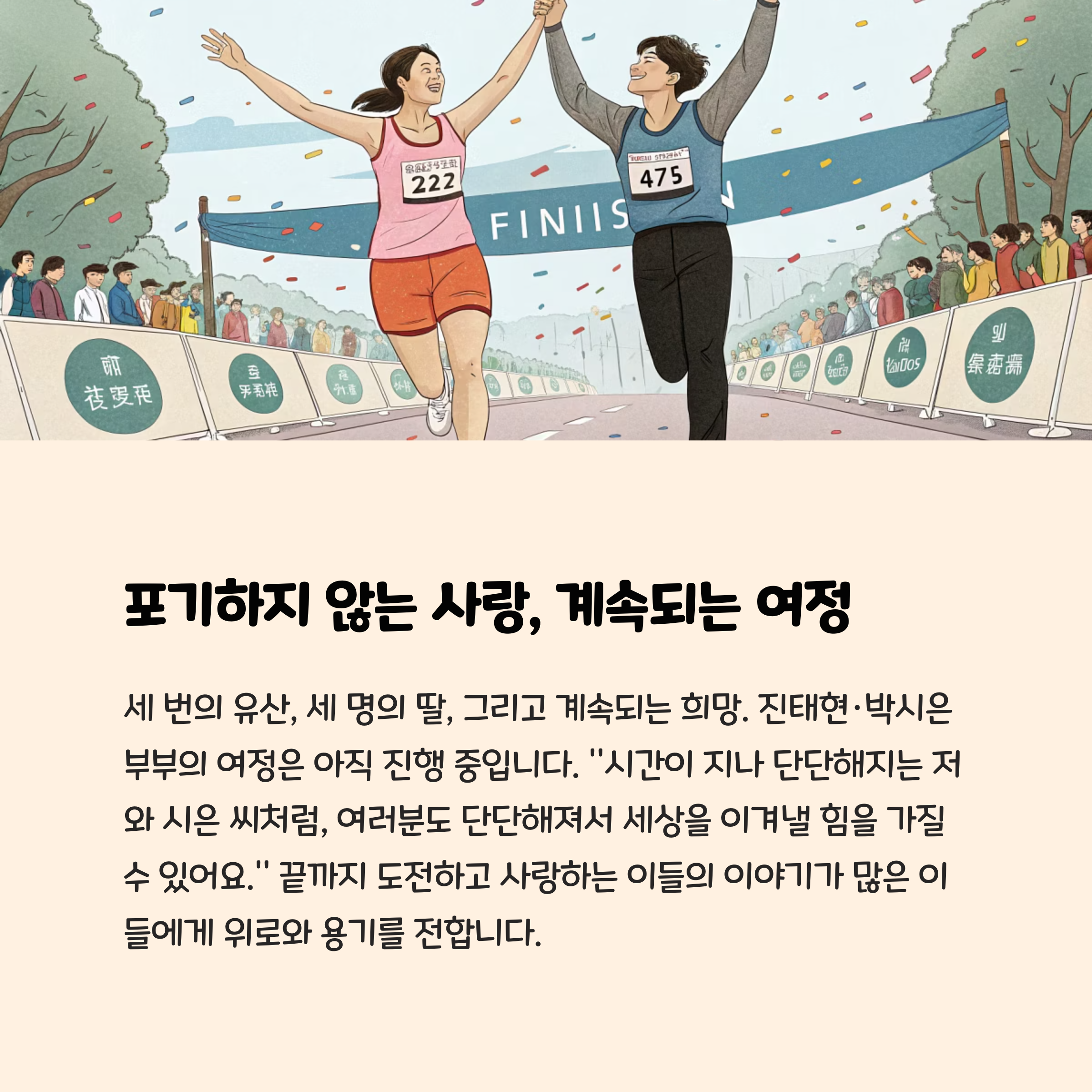 진태현·박시은 부부의 2세 도전기는 단순한 출산의 이야기가 아니라, 상실과 회복, 그리고 사랑의 확장에 관한 기록입니다. 세 번의 유산이라는 깊은 상처에도 불구하고, 이들은 가족의 의미를 더 넓게 받아들이고, 건강한 몸과 마음을 위해 꾸준히 노력하며, 다시 희망을 품고 있습니다. 이들의 이야기가 같은 고민을 가진 이들에게 작은 위로와 용기가 되길 바랍니다. “포기할 이유가 없기에, 끝까지 해보겠다”는 이들의 다짐처럼, 여러분도 자신의 속도로 천천히, 그러나 멈추지 않고 나아가시길 응원합니다.