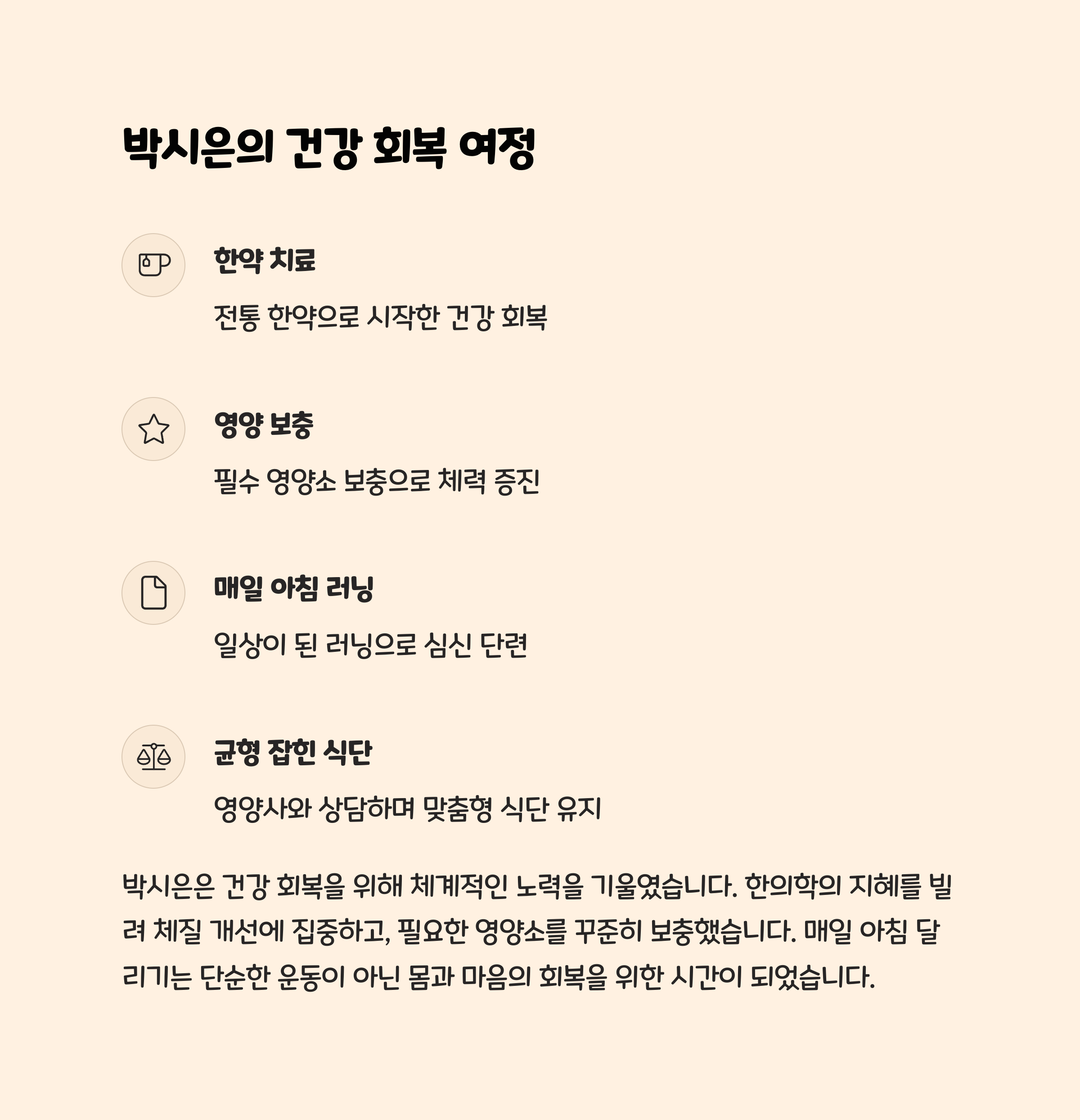 - 꾸준한 건강 관리 : 박시은은 몸을 회복하기 위해 한약과 영양제를 챙겨 먹고, 달리기와 필라테스를 통해 체력을 키웠습니다.