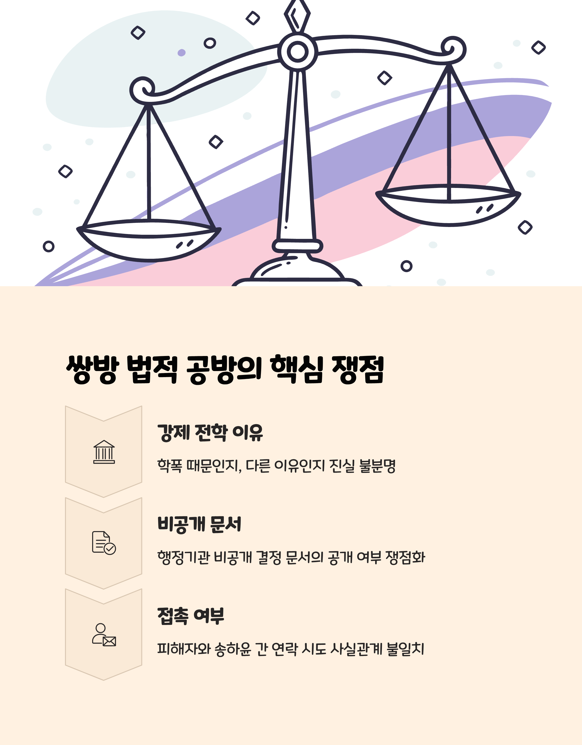 - 행정기관에 강제 전학 관련 문서 존재 여부를 공식적으로 확인했으며, 해당 문서가 '비공개 결정'으로 확인된 점을 근거로 송하윤 측 고소가 허위임을 증명한다고 주장하고 있습니다.