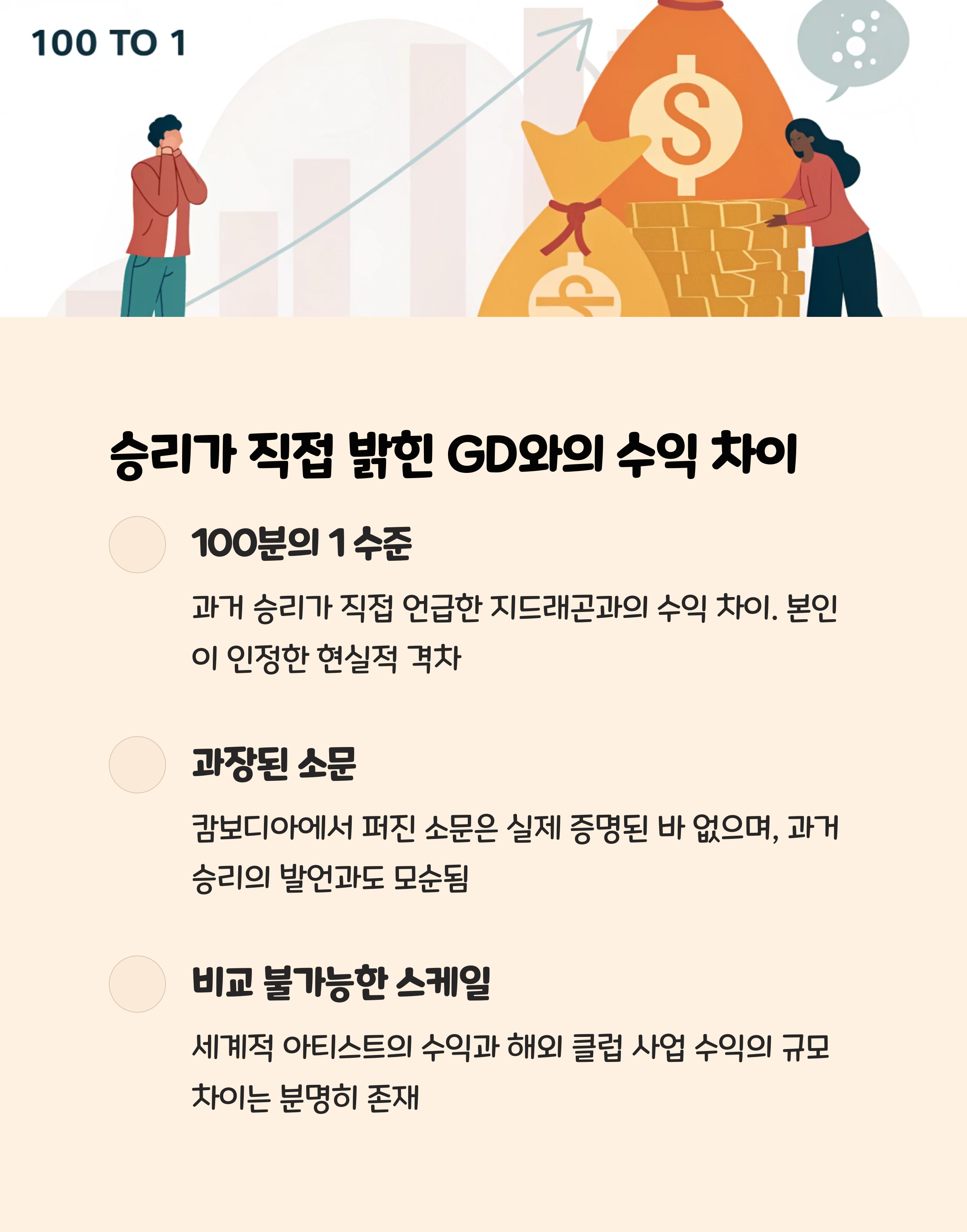 하지만 과거 승리가 직접 밝힌 내용에 따르면, 2018년 기준으로 자신의 수입이 “지드래곤의 100분의 1 수준”이라고 언급한 바 있습니다.