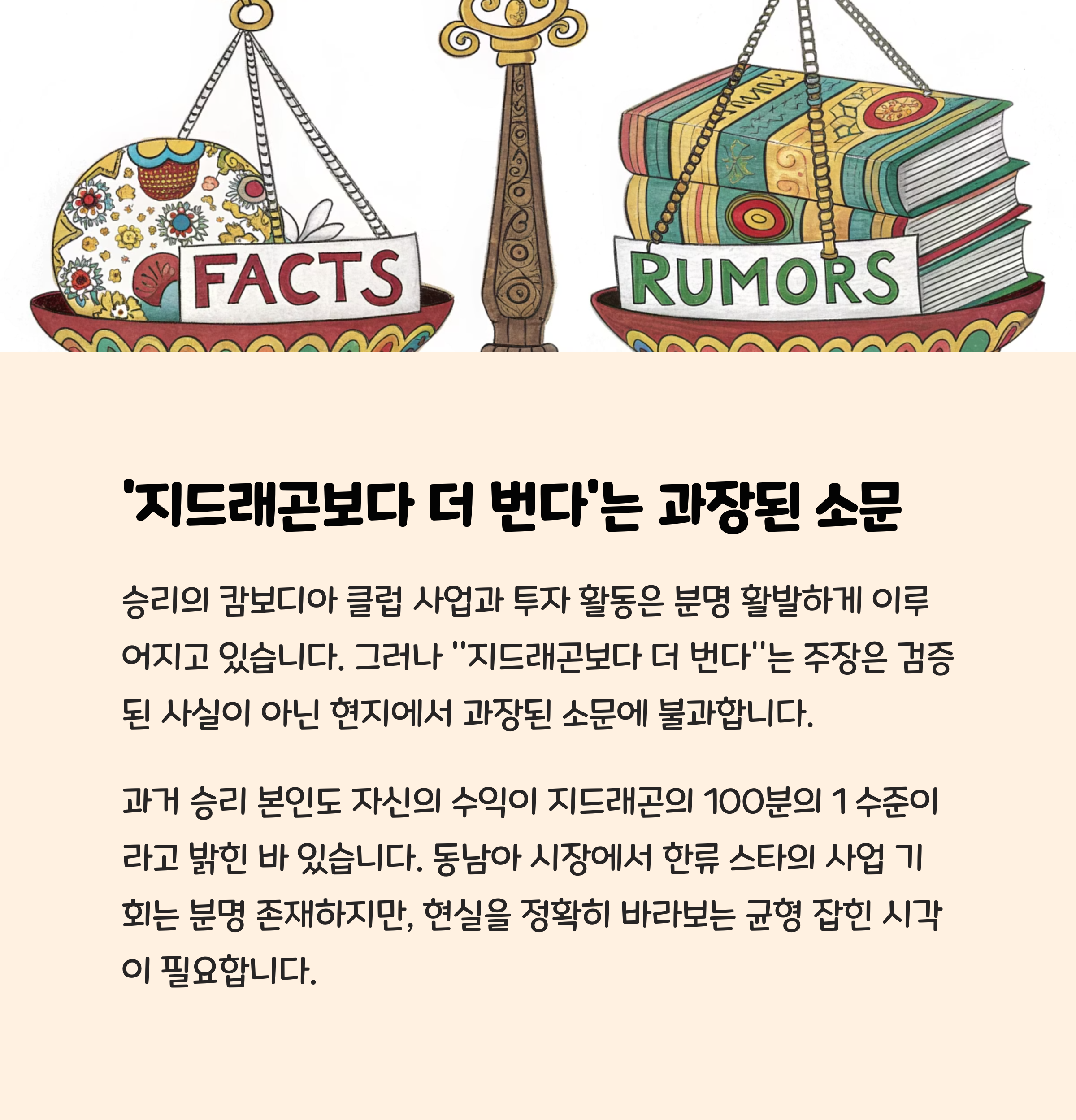 2024~2025년 현재, 승리가 캄보디아 등 동남아에서 클럽 사업을 확장하고 투자 미팅을 이어가고 있지만, 정확한 수익 규모나 순이익이 공개된 바는 없습니다. 다만, “지드래곤보다 더 번다”는 말은 확인된 팩트라기보다는 현지에서 과장된 소문에 가깝습니다.