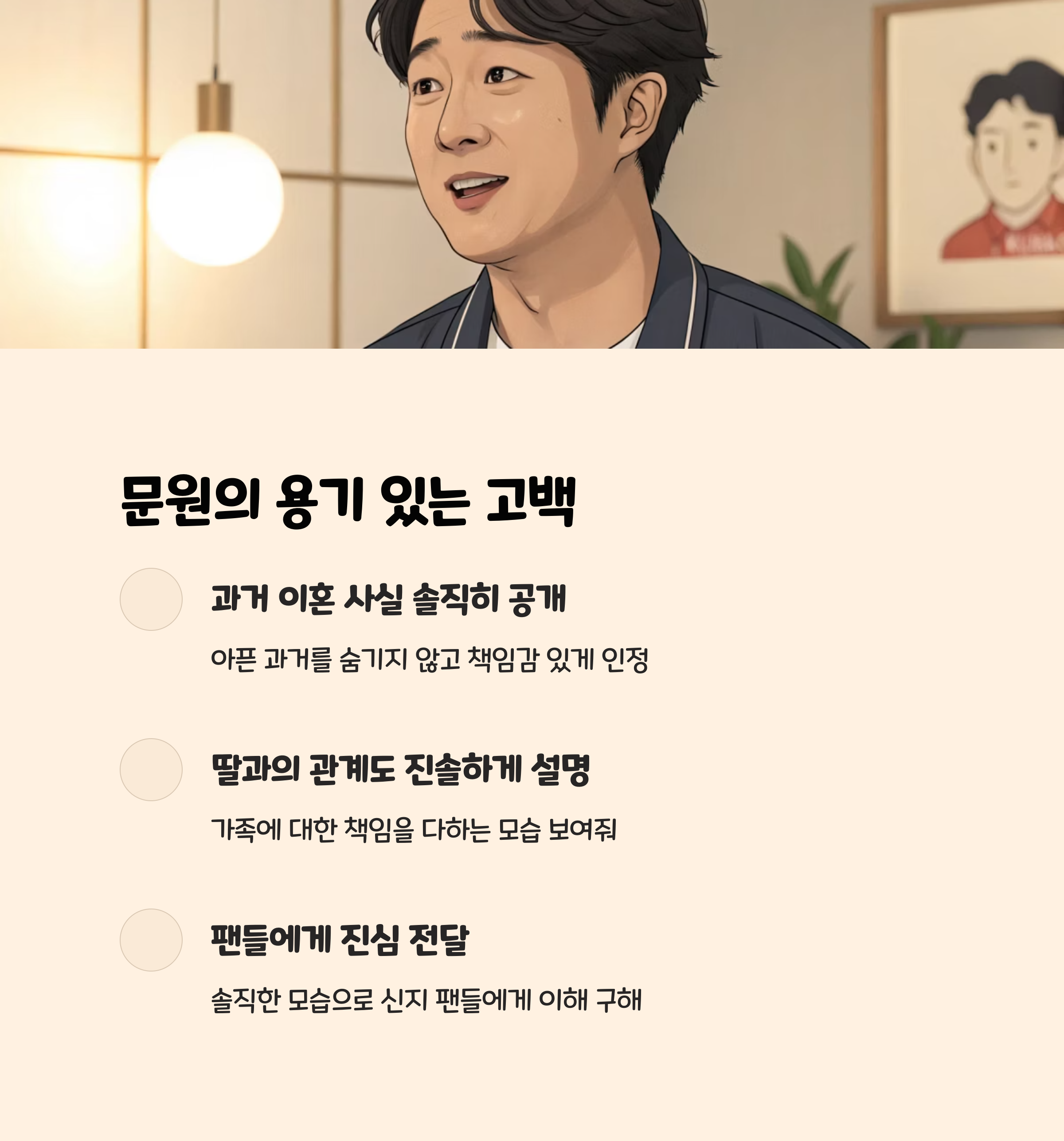 2025년 7월 2일, 신지의 유튜브 채널 ‘어떠신지?!?’에 공개된 영상에서 문원은 자신의 이혼 경험과 딸의 존재를 직접 밝혔습니다. “결혼을 한 번 했었고, 사랑스러운 딸이 한 명 있다. 전 부인이 키우고 있지만, 아이를 위해 소통하며 책임을 다하고 있다”고 고백했습니다. 이 사실은 신지와의 관계가 깊어질 무렵 솔직하게 털어놨으며, 신지는 이미 문원의 과거를 알고 결혼을 결심했다고 밝혔습니다.