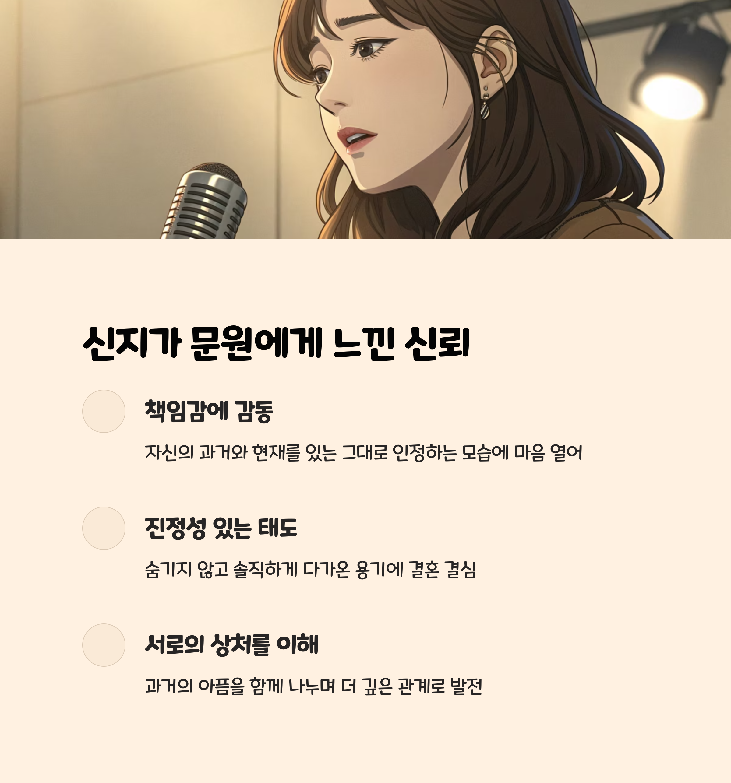 신지는 문원이 자신의 과거를 숨기지 않고 솔직하게 밝힌 점에 큰 신뢰를 느꼈다고 밝혔습니다. 오히려 문원의 책임감 있는 태도가 결혼을 결심하는 데 긍정적으로 작용했다고 강조했습니다.