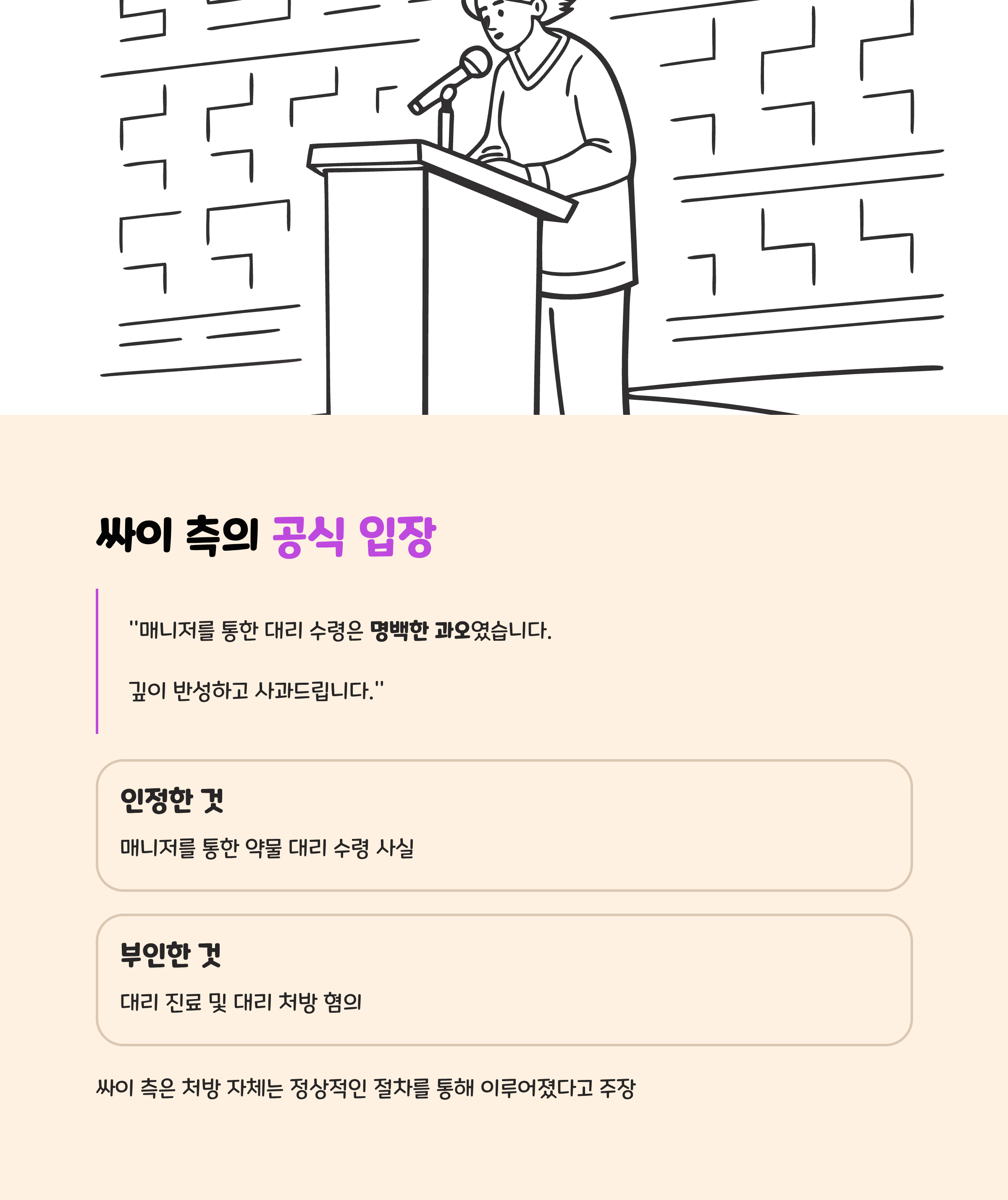 싸이 소속사는 대리 수령 건에 대해 “명백한 과오이자 불찰”임을 인정하며 공개 사과했습니다. 다만 대리 처방 혐의는 부인하고 있으며, 싸이가 만성 수면 장애로 의료진 지시에 따라 처방받아 복용했다고 밝혔습니다. 약을 대신 받은 것은 사실이나 복용량이나 용도에 문제는 없었다고 설명했습니다.