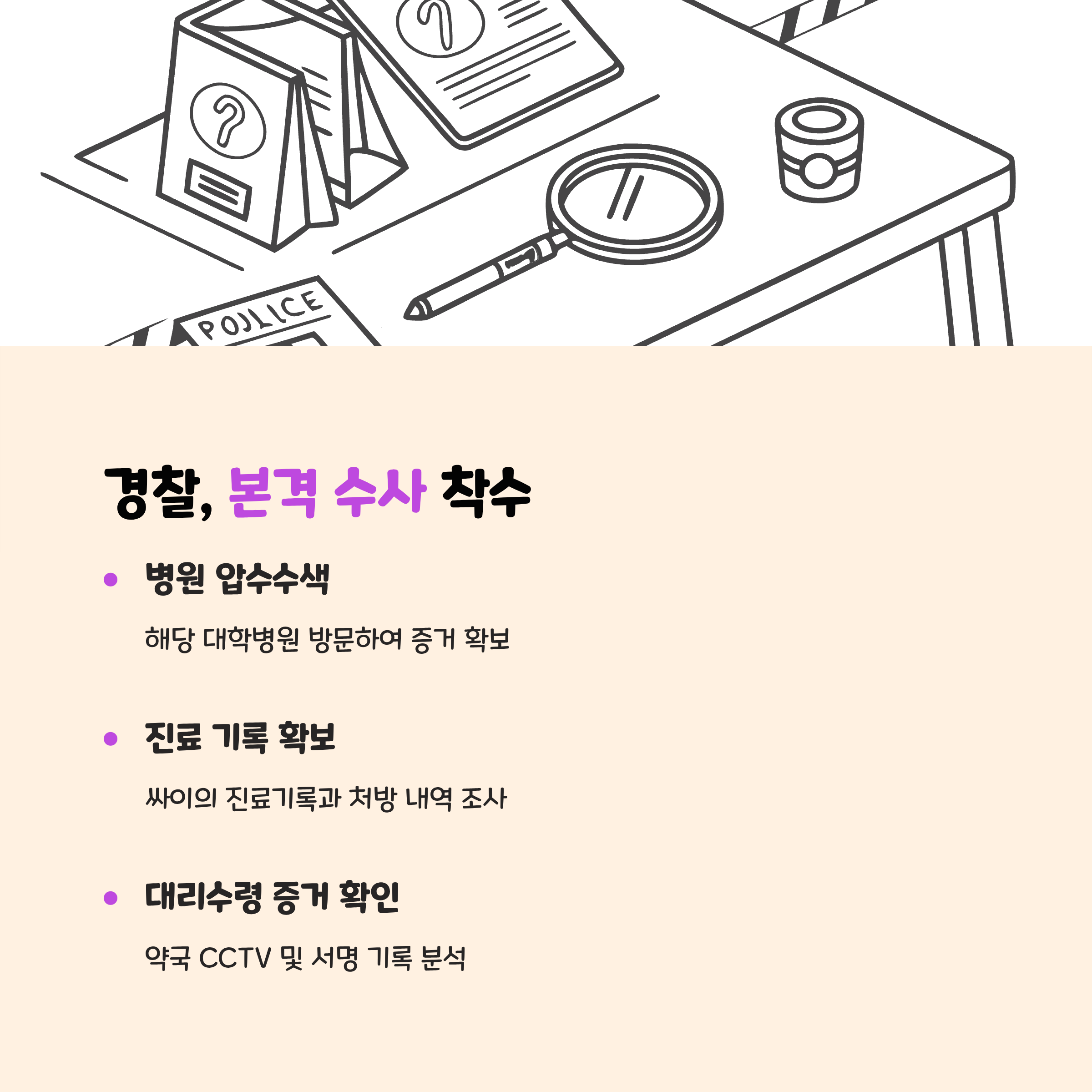 현재 경찰은 해당 병원에 대해 압수수색을 실시하고 진료 기록, 처방 내역 등 관련 자료를 확보했습니다. 싸이와 의사에 대해 사실관계를 집중 조사 중이며, 향정신성의약품 관리 의무 위반 여부, 그리고 대리 수령 과정의 법적 문제점에 대해 면밀히 검토하고 있습니다.