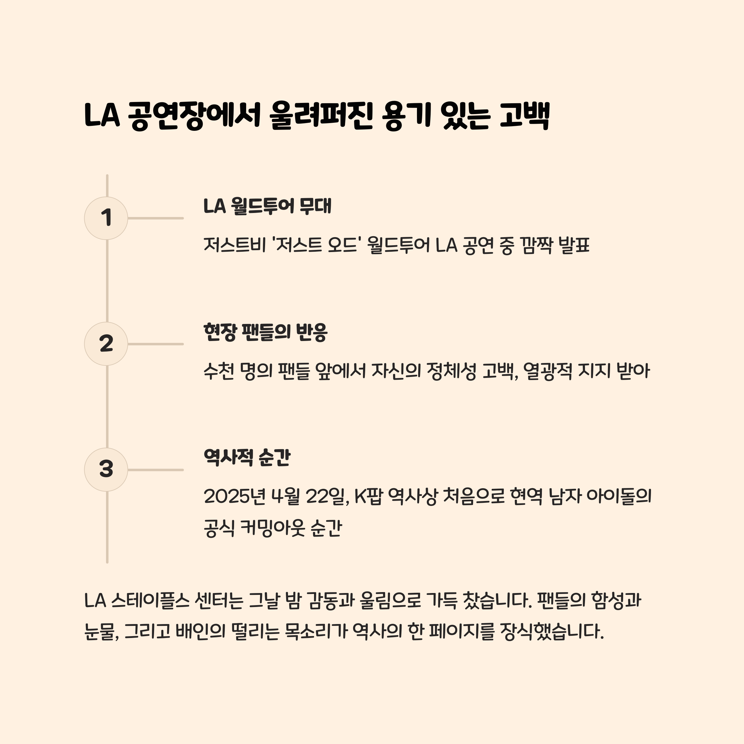 배인 씨의 커밍아웃은 K팝과 한국 사회에 다양성과 존중의 중요성을 일깨워준 의미 있는 사건입니다. 그의 용기가 비슷한 고민을 하는 이들에게 힘이 되길 바라며, 앞으로 더 많은 사람들이 자신을 솔직하게 표현할 수 있는 사회가 되기를 기대합니다.