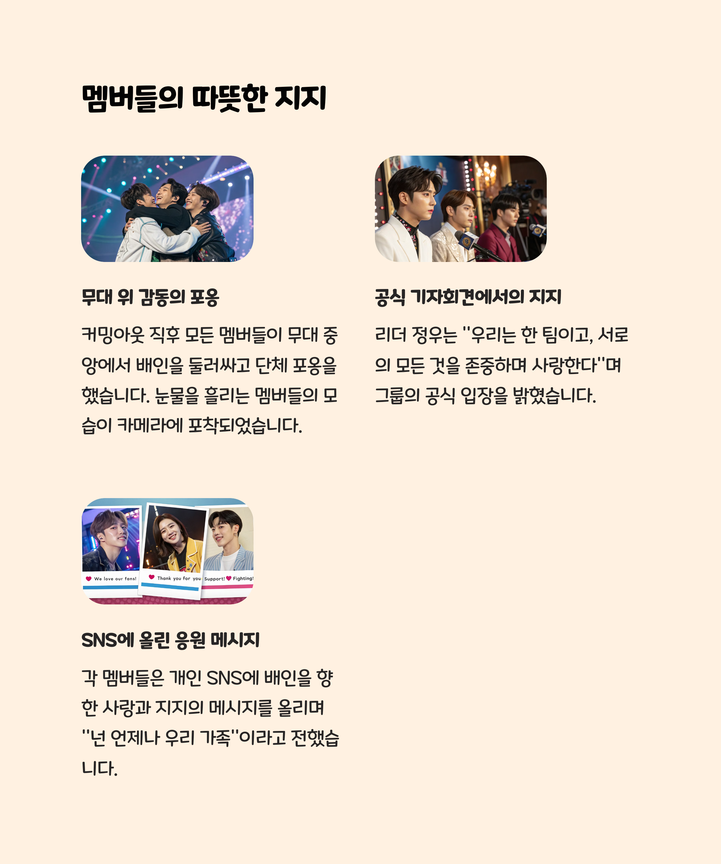 • 같은 멤버 시우 씨도 “용기에 박수를 보낸다”며 진심 어린 지지 메시지를 남겼습니다.