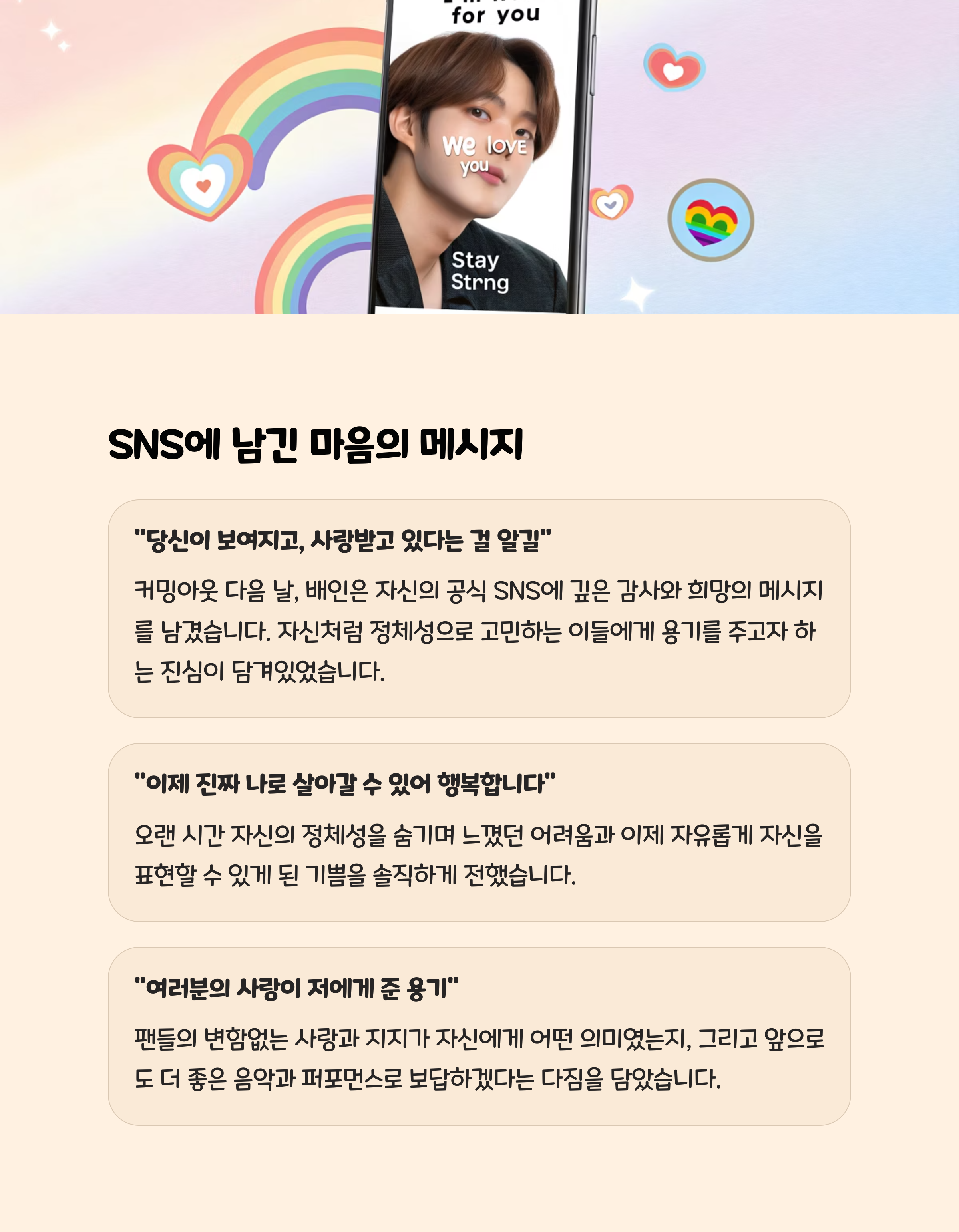 배인 씨는 커밍아웃 후 어떤 메시지를 남겼나요?