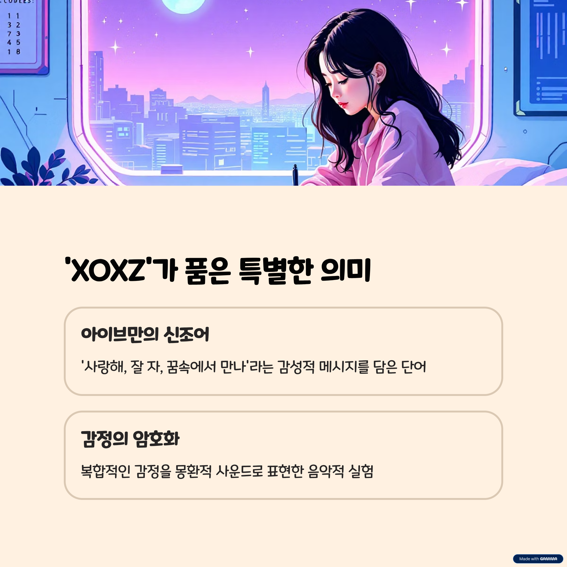- ‘XOXZ’는 단순한 사랑 노래가 아닌, 복합적인 감정을 암호처럼 표현하는 곡으로 다층적인 감정이 느껴짐.