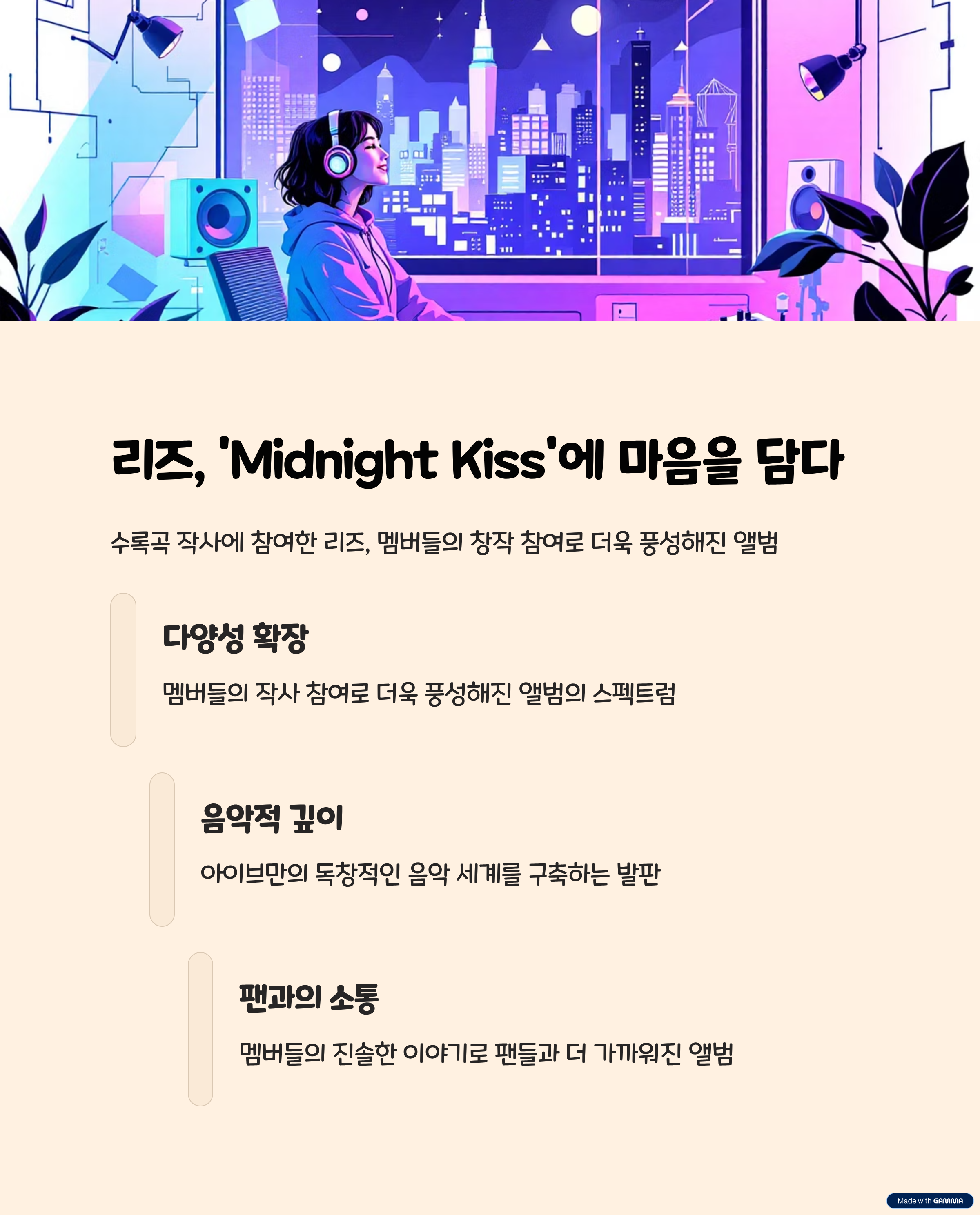 - 또한, 리즈도 수록곡 ‘Midnight Kiss’ 작사에 참여하여 팀의 음악적 다양성과 깊이를 더함.