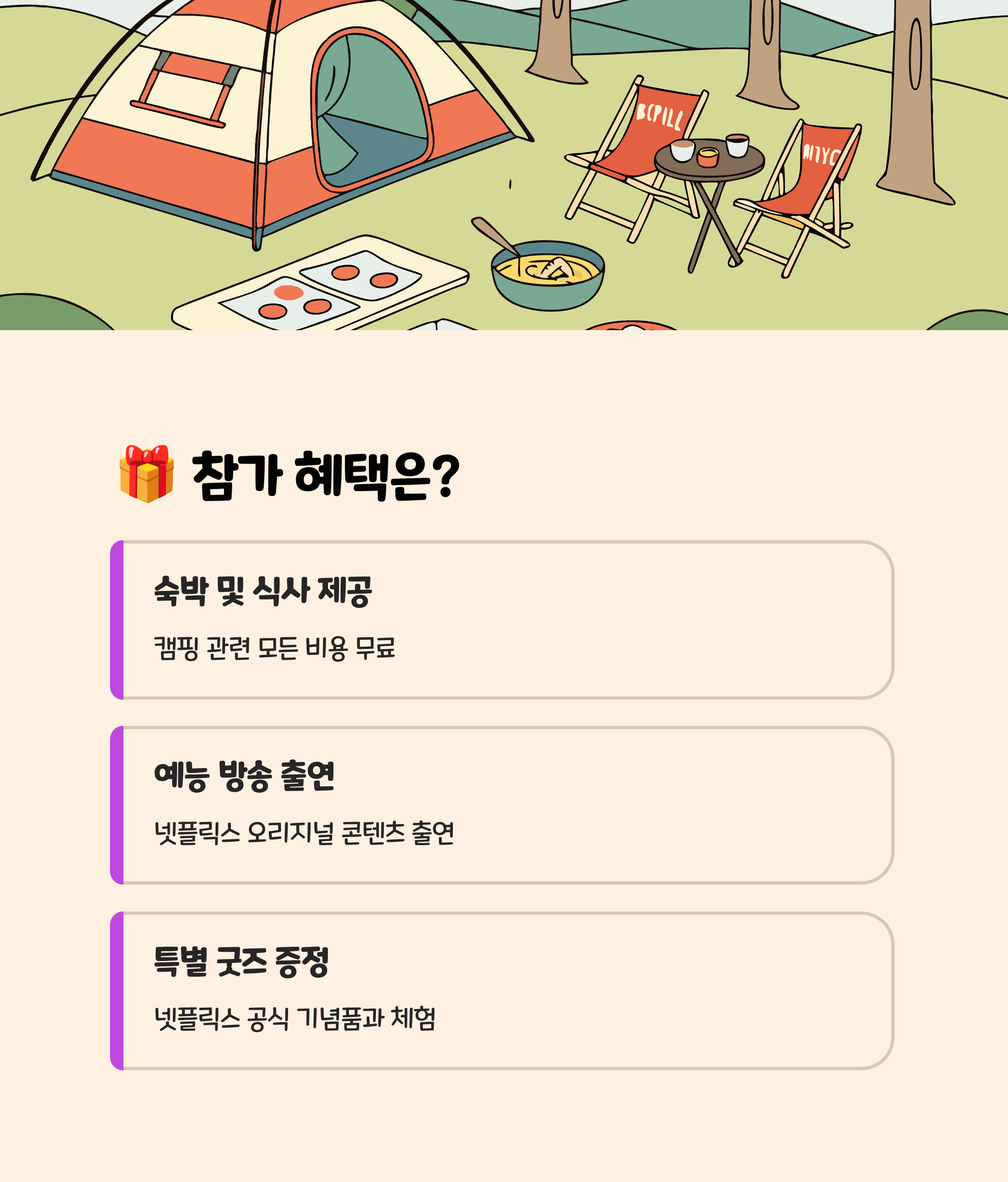 • 캠핑 숙박 및 식사, 각종 체험 무료 제공