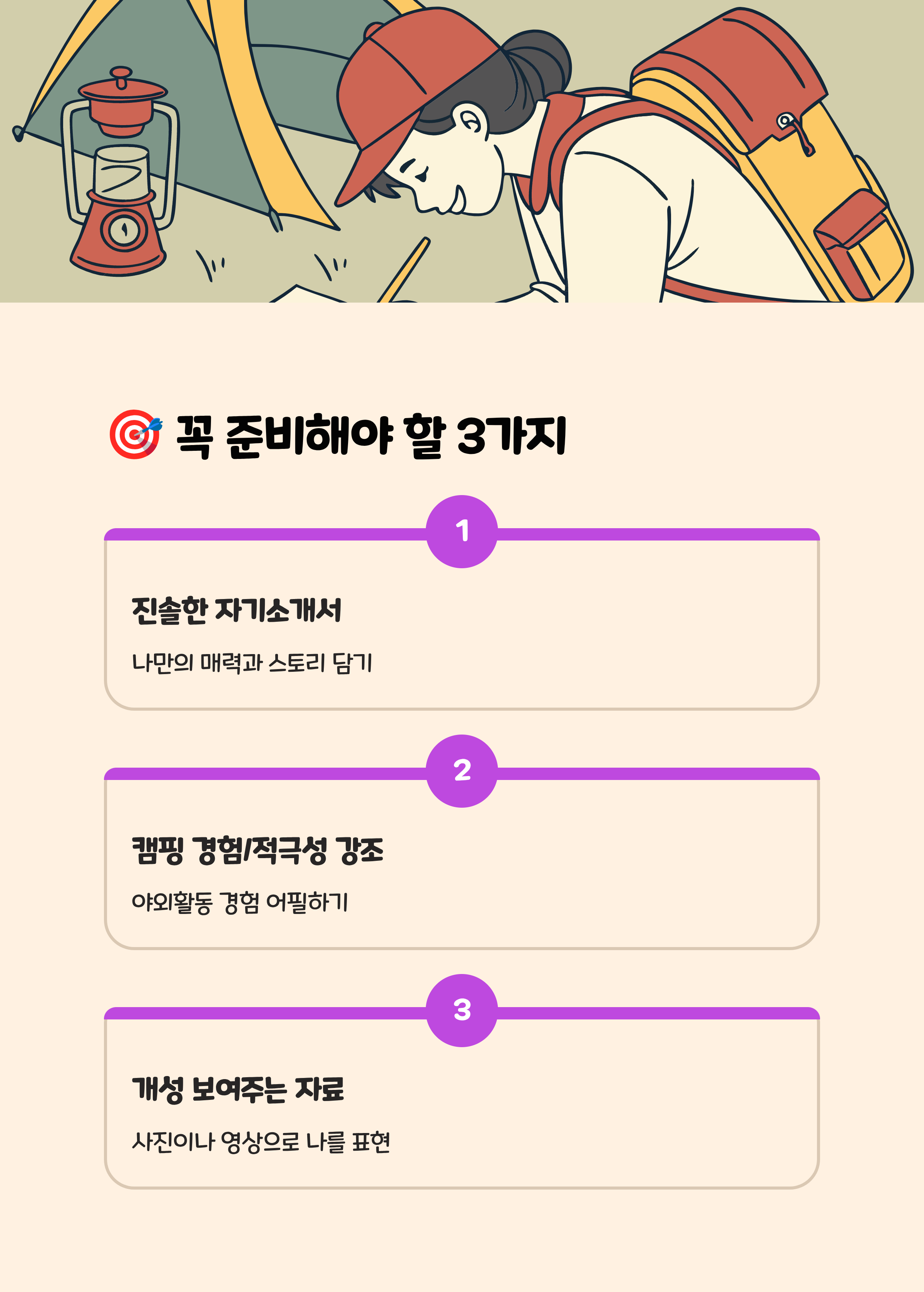 • 자기소개는 스토리텔링으로: 캠핑 경험, 유재석 예능 팬심 등 자신의 특별한 사연을 적극 어필