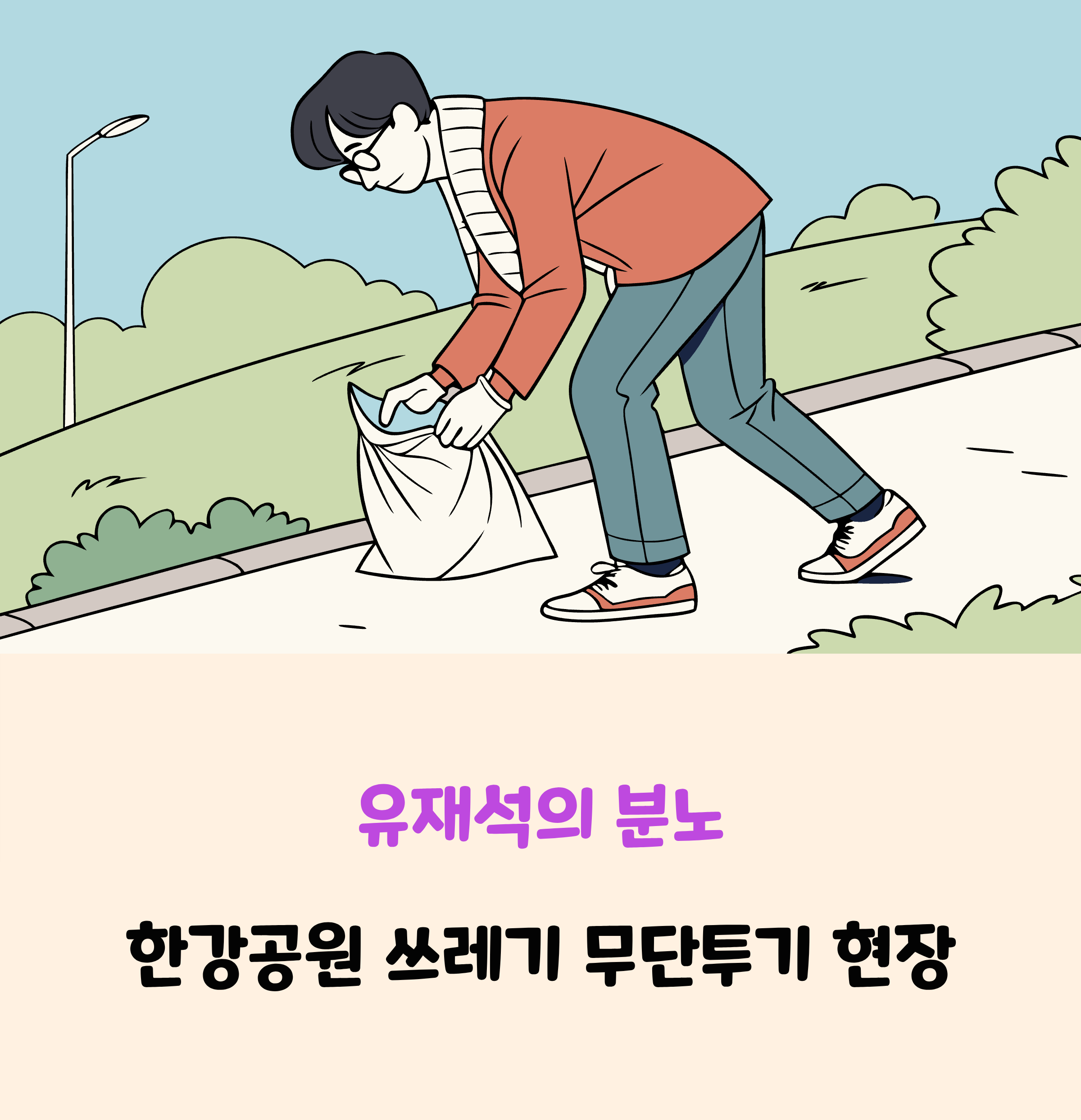 한강공원은 서울 시민들의 휴식 공간으로 주말 평균 50만 명 이상이 방문하지만, 일부 무단투기 때문에 쓰레기가 쌓여 환경오염과 미관 저해, 공공위생 문제가 발생합니다. 쓰레기 관리와 청소에 매년 수십억 원의 비용이 들며 청소 인력 역시 부족한 상황입니다.