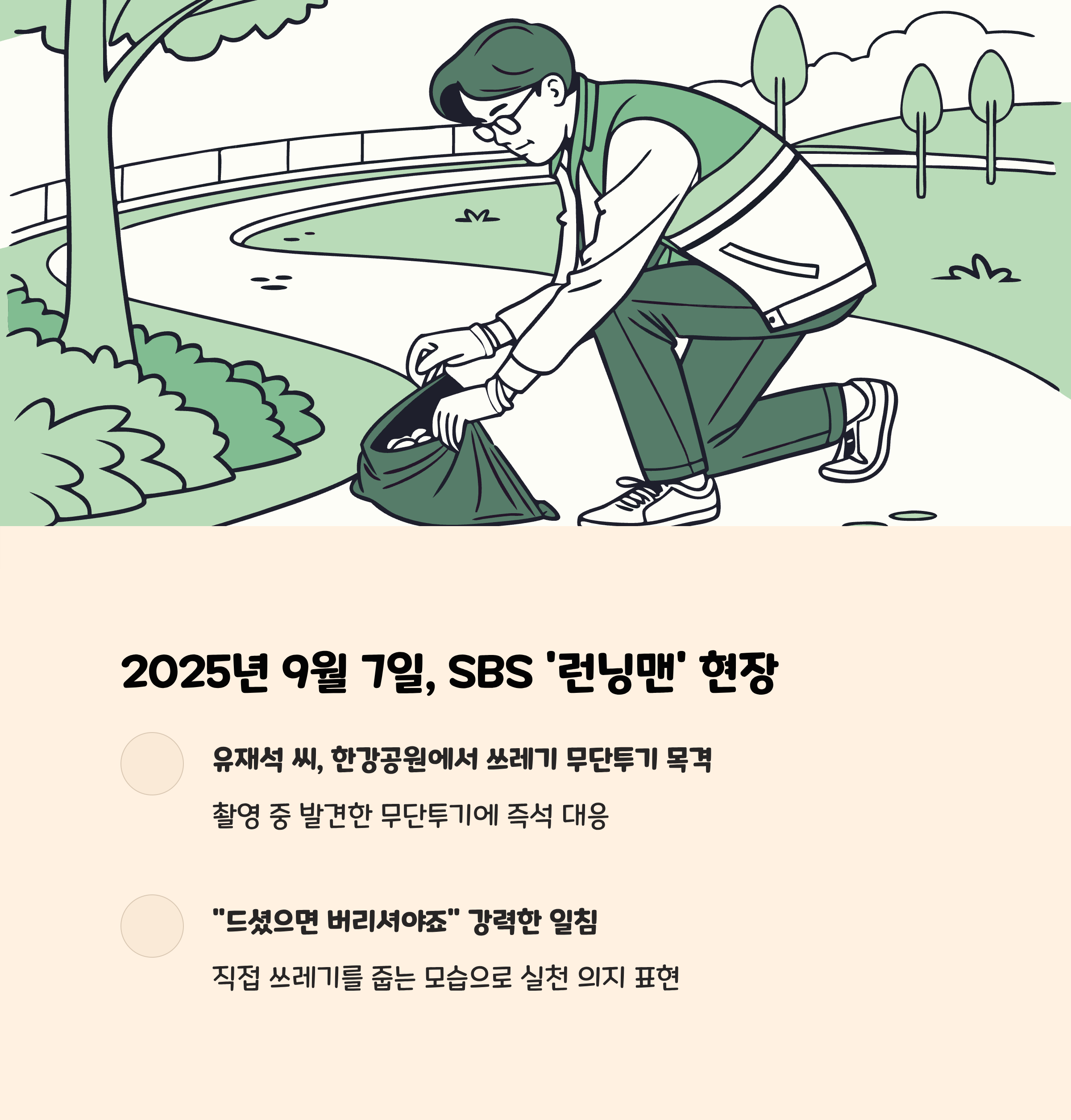 2025년 9월 7일 방송된 런닝맨에서 유재석 씨는 한강공원의 심각한 쓰레기 무단투기를 목격하고 “드셨으면 버리셔야 한다”며 강력 비판했습니다. 그의 행동은 방송을 넘어 시민들에게 올바른 환경의식을 촉구하는 메시지로 큰 반향을 일으켰습니다.