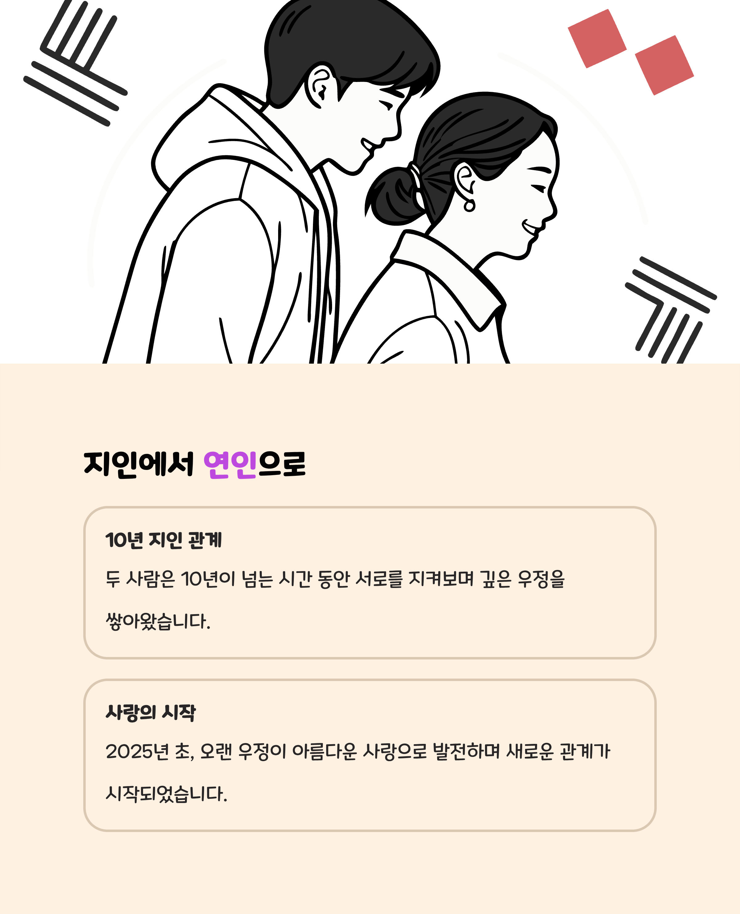 • 두 사람은 10여 년 전부터 알고 지낸 사이였으며, 동생 같은 사이로 지내오다 2025년 초 연인 관계로 발전했습니다.