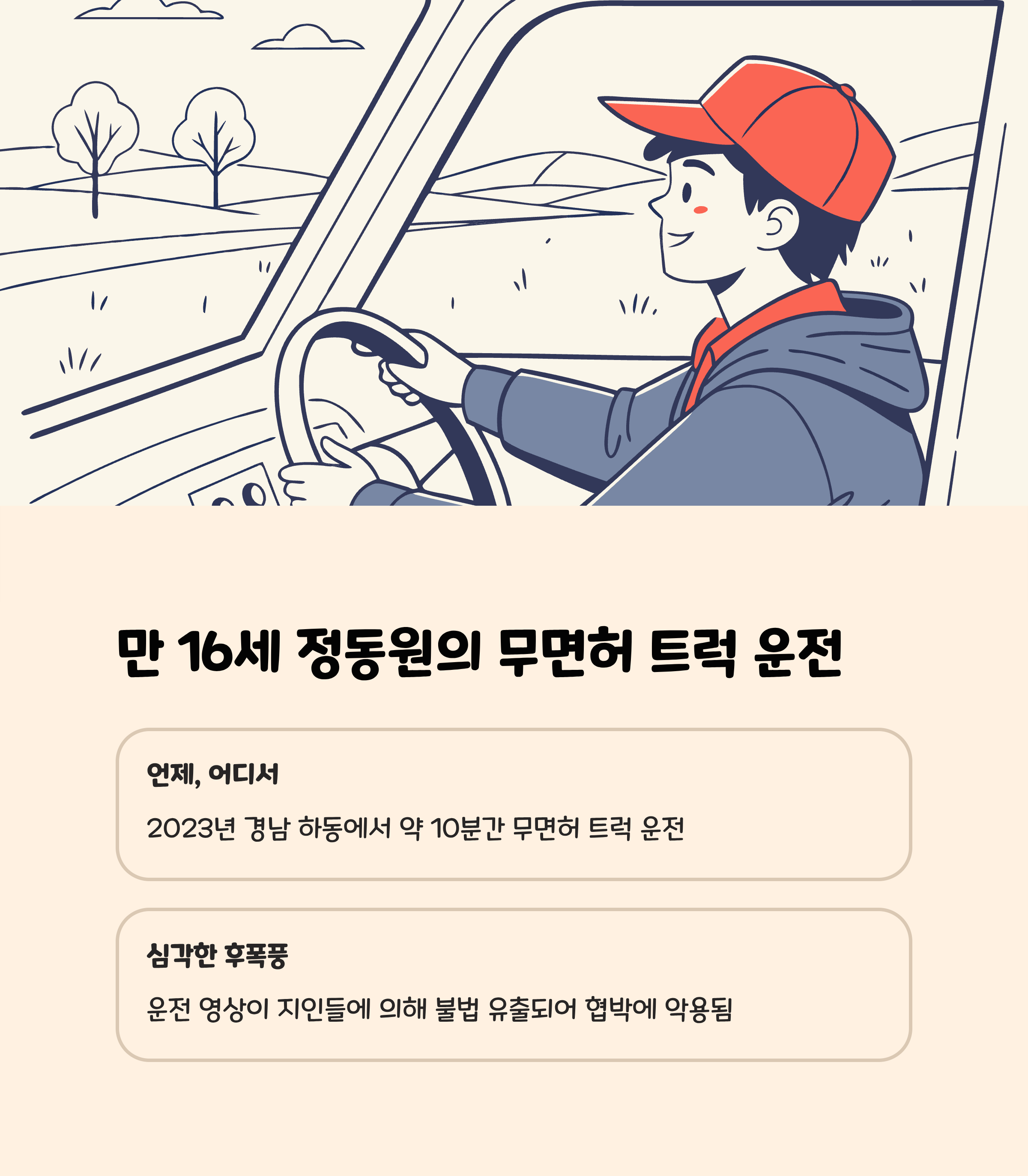 • 운전 시기 및 사건 개요: 2023년 경남 하동에서 당시 만 16세였던 정동원이 운전면허 취득이 불가능한 나이에 트럭을 운전한 혐의가 포착되었습니다.