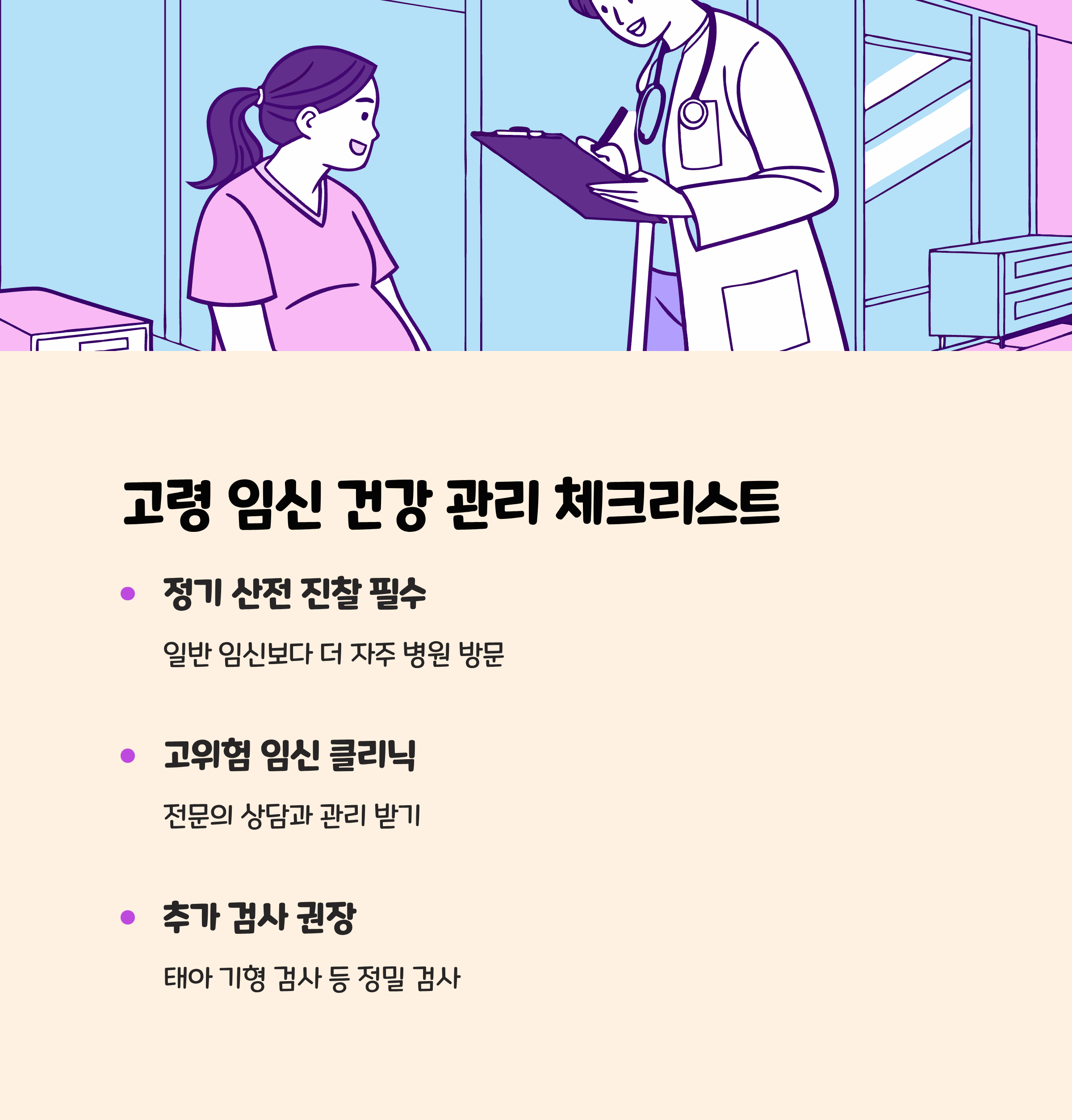 고령 임신일수록 주기적인 산전검사와 철저한 건강 관리가 중요합니다. 균형 잡힌 식단, 적정 체중 관리, 충분한 휴식, 정기 진찰을 꼼꼼히 챙기며 스트레스 관리가 필요합니다.